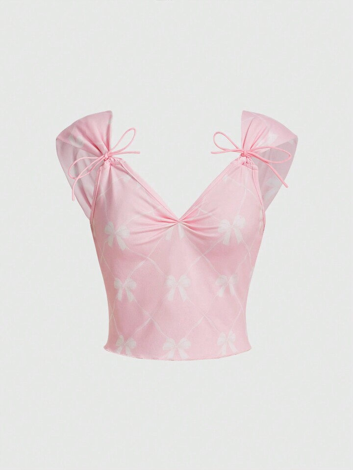 Kawaii Women'S Bow Printing Ruched Self Tie Front Tank Top