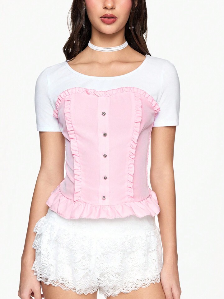 Kawaii Women's 2 In 1 Cute Bowknot Embellished Round Neck T-Shirt