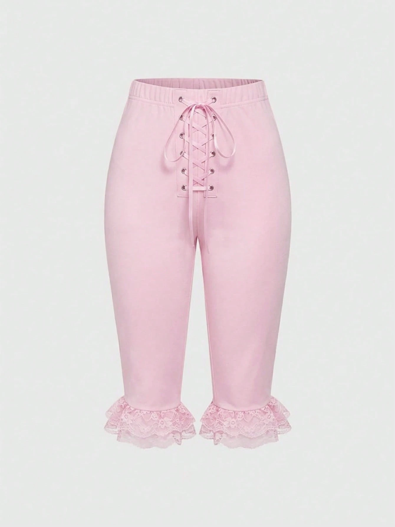 Kawaii Women's Basic Y2K Millennium Style Lace Patchwork Tie-Up Capri Pants