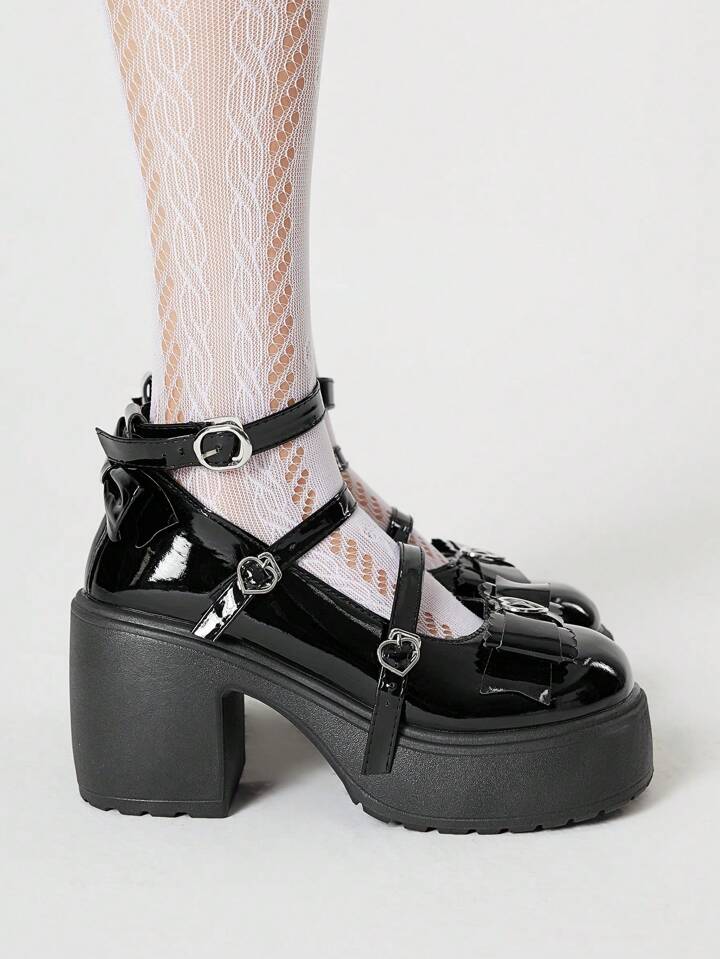Kawaii Women's Black Loafers, Mary Jane Style Leather Shoes With Bowknot Criss-Cross Strap And Heart-Shaped Design, High Heel Shoes