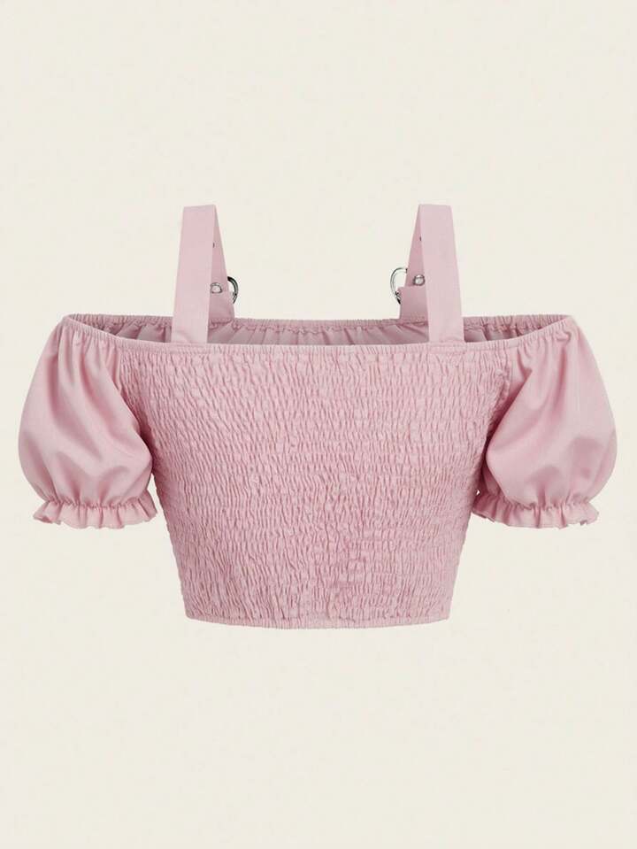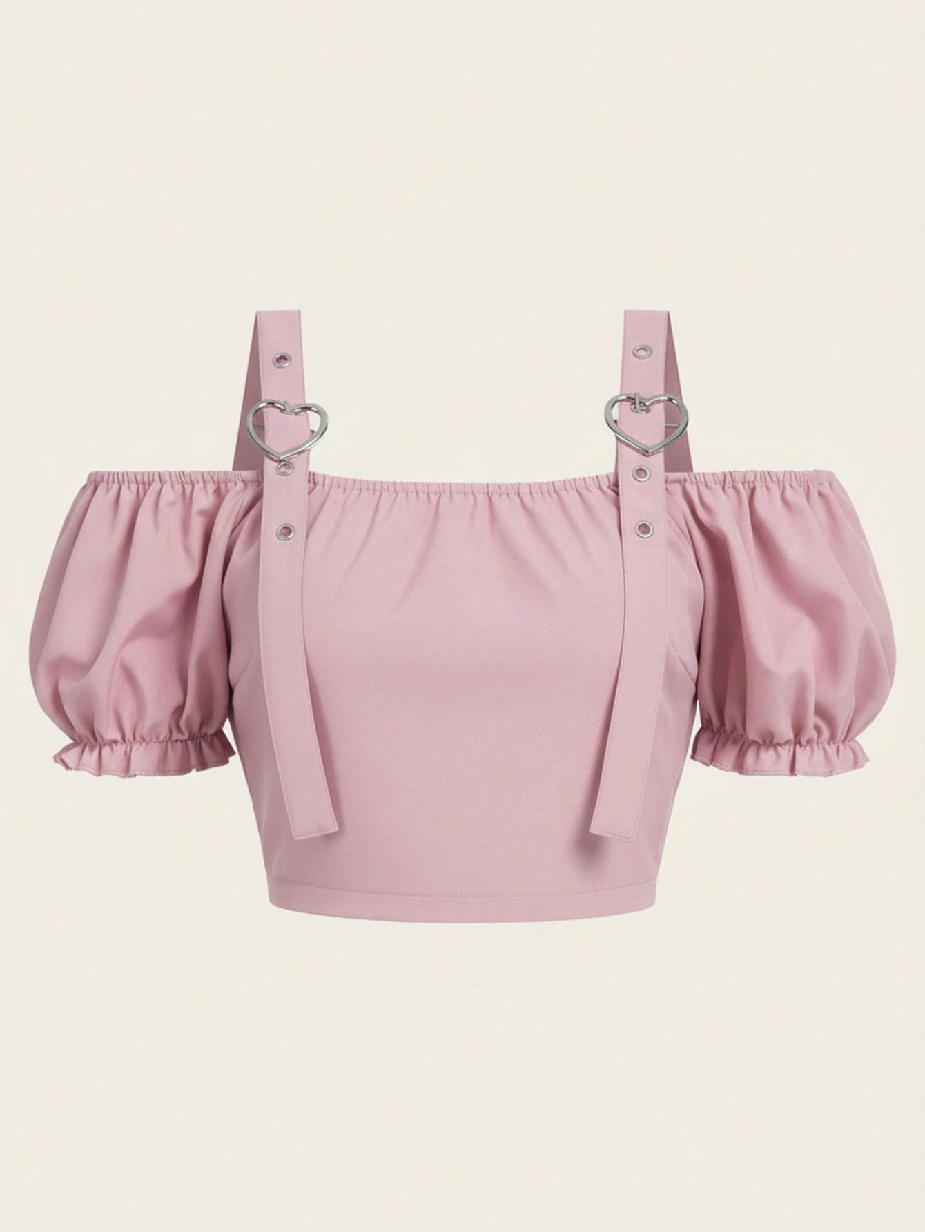 Kawaii Women's Casual Daily Commute Simple Solid Color Adjustable Strap Cold Shoulder Frill Puff Sleeve Fitted Cropped Top, Summer