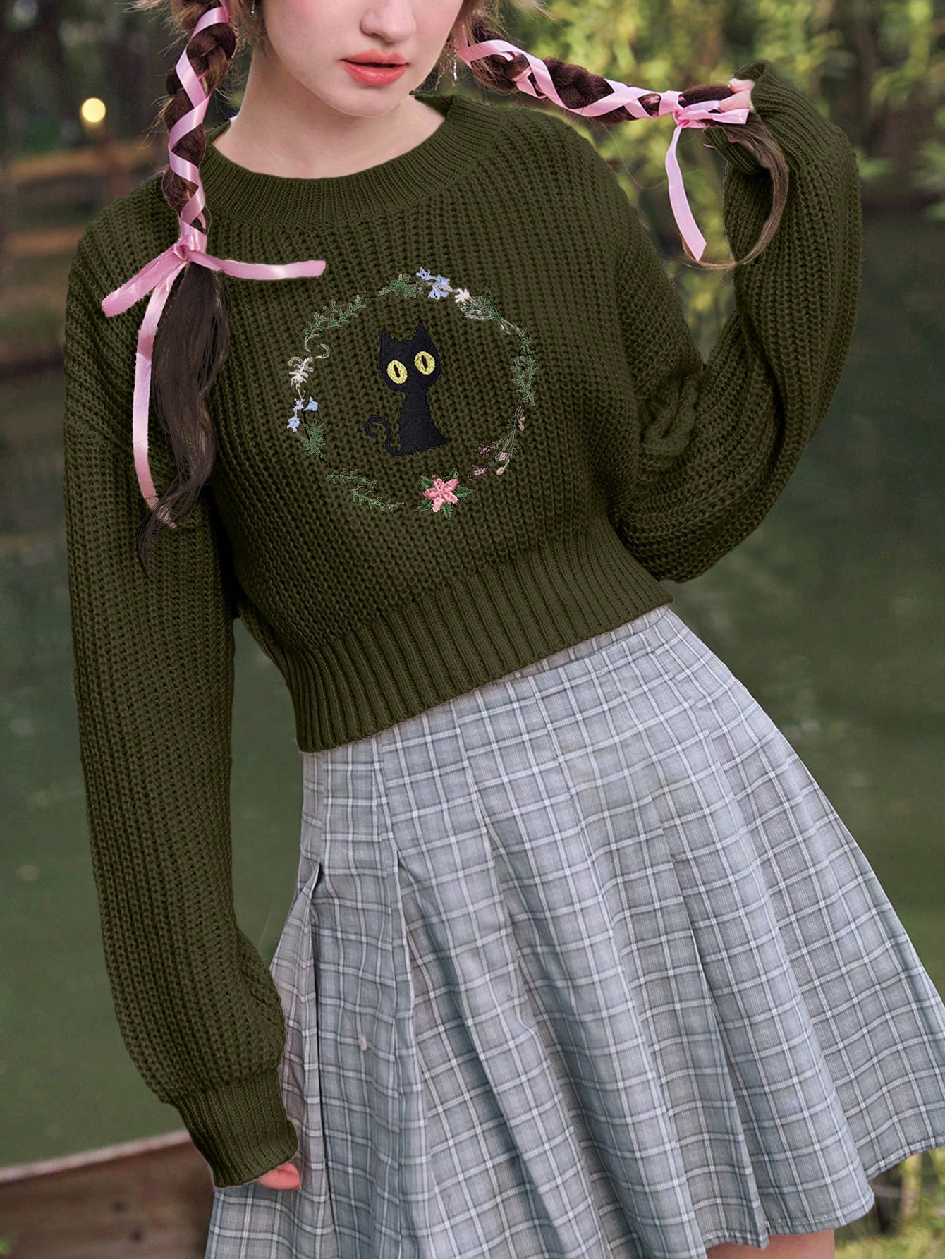 Kawaii Women's Cat Embroidery Drop Shoulder Sweater