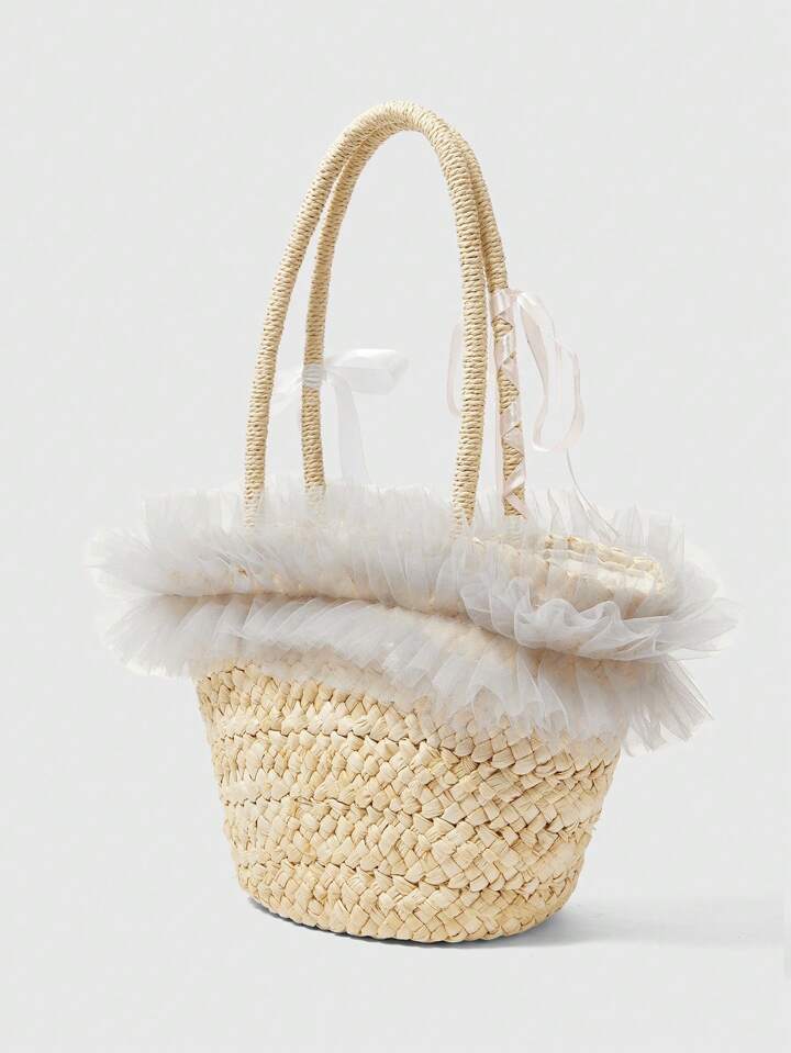 Kawaii Women's Contrast Mesh Ruffle 3D Flower Decor Bohemian Style Crossbody Bag
