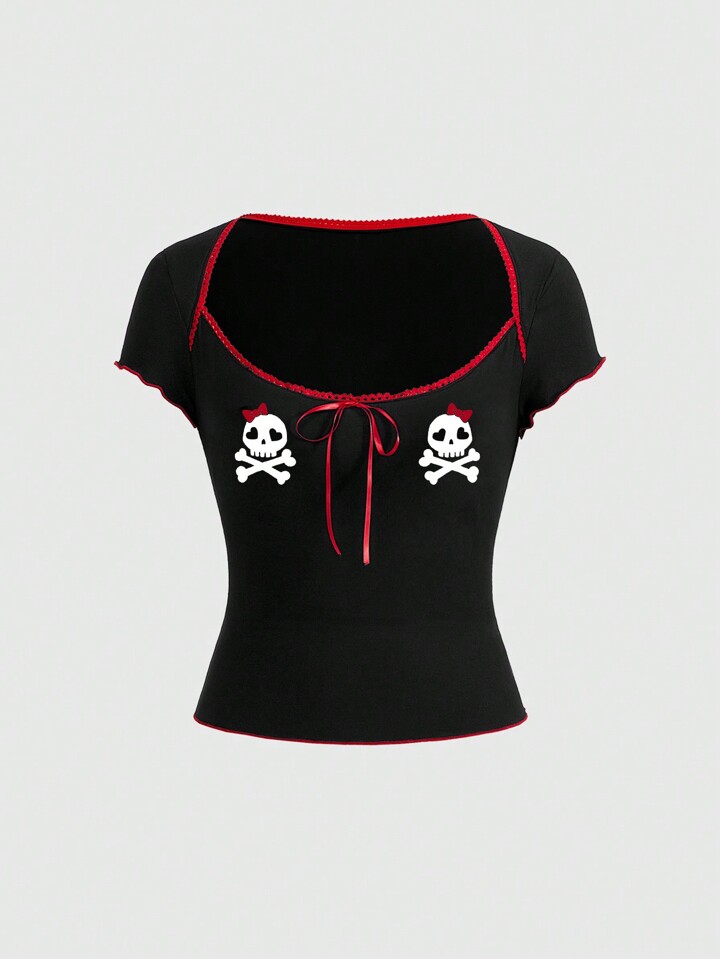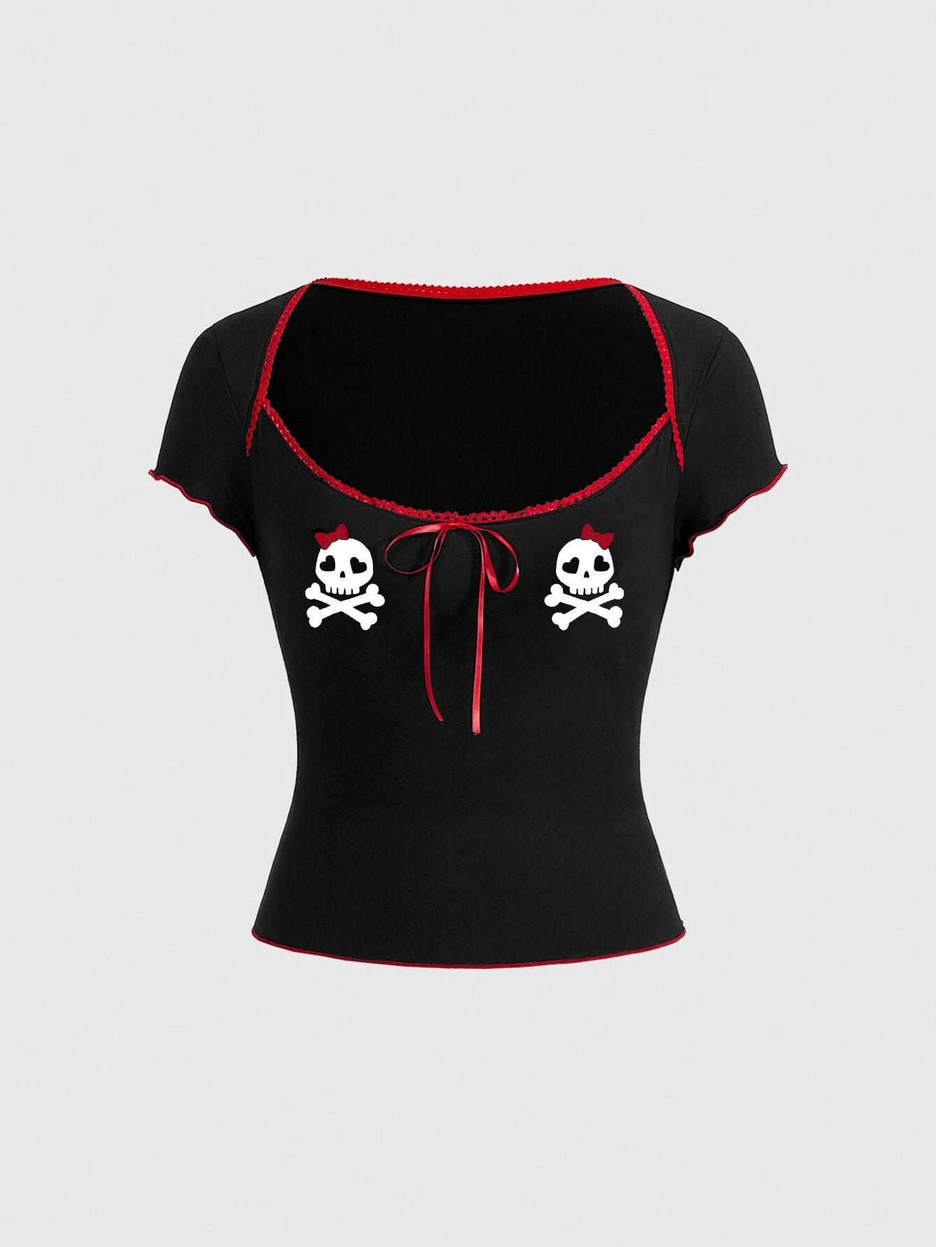 Kawaii Women's Cute Skull Print Bow-Tie Crop Top