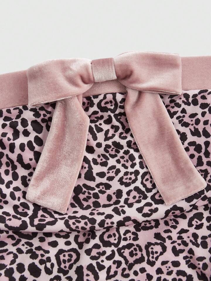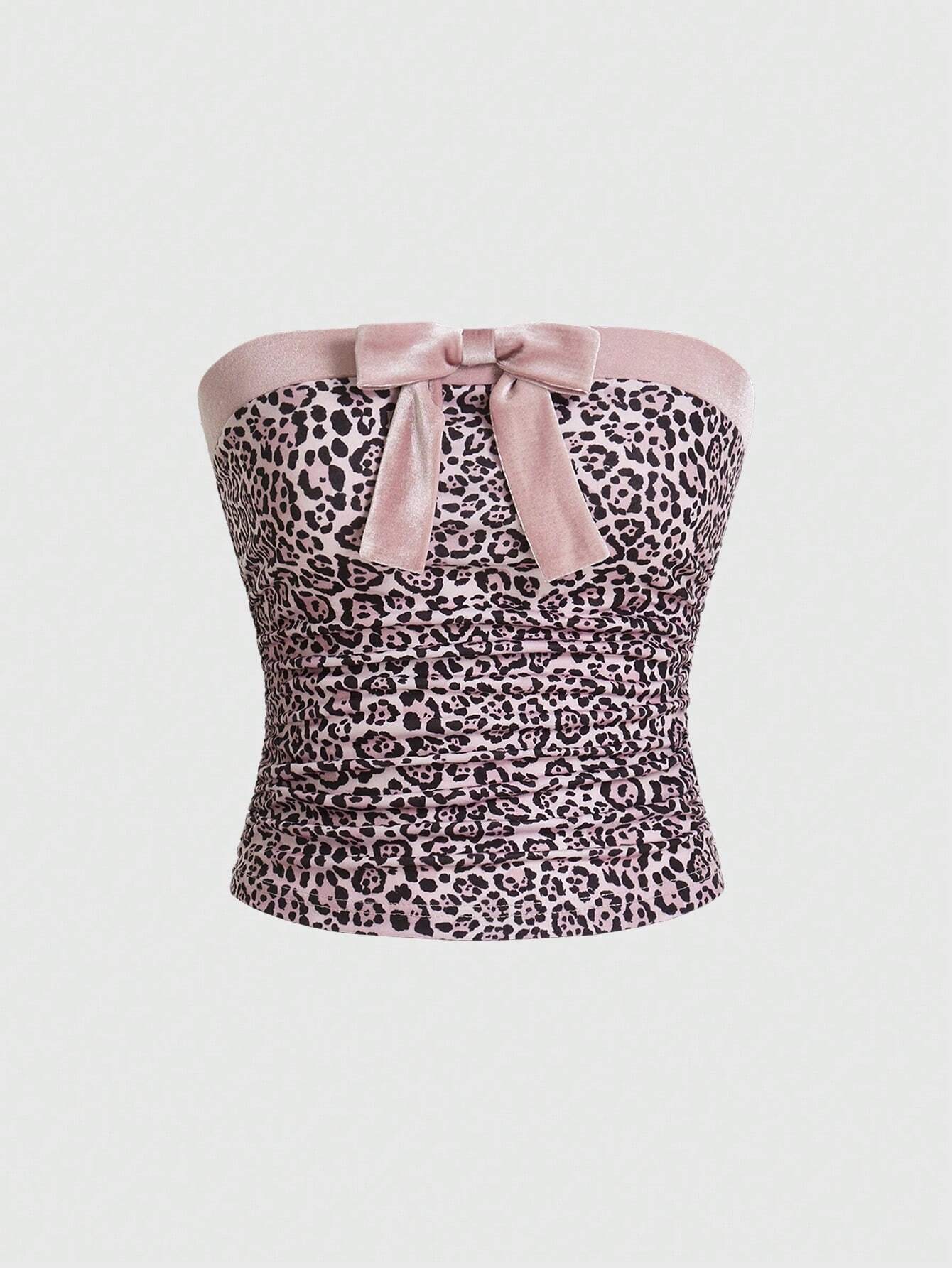 Kawaii Women's Fashionable Pink Leopard Print Strapless Top With Bow Decoration