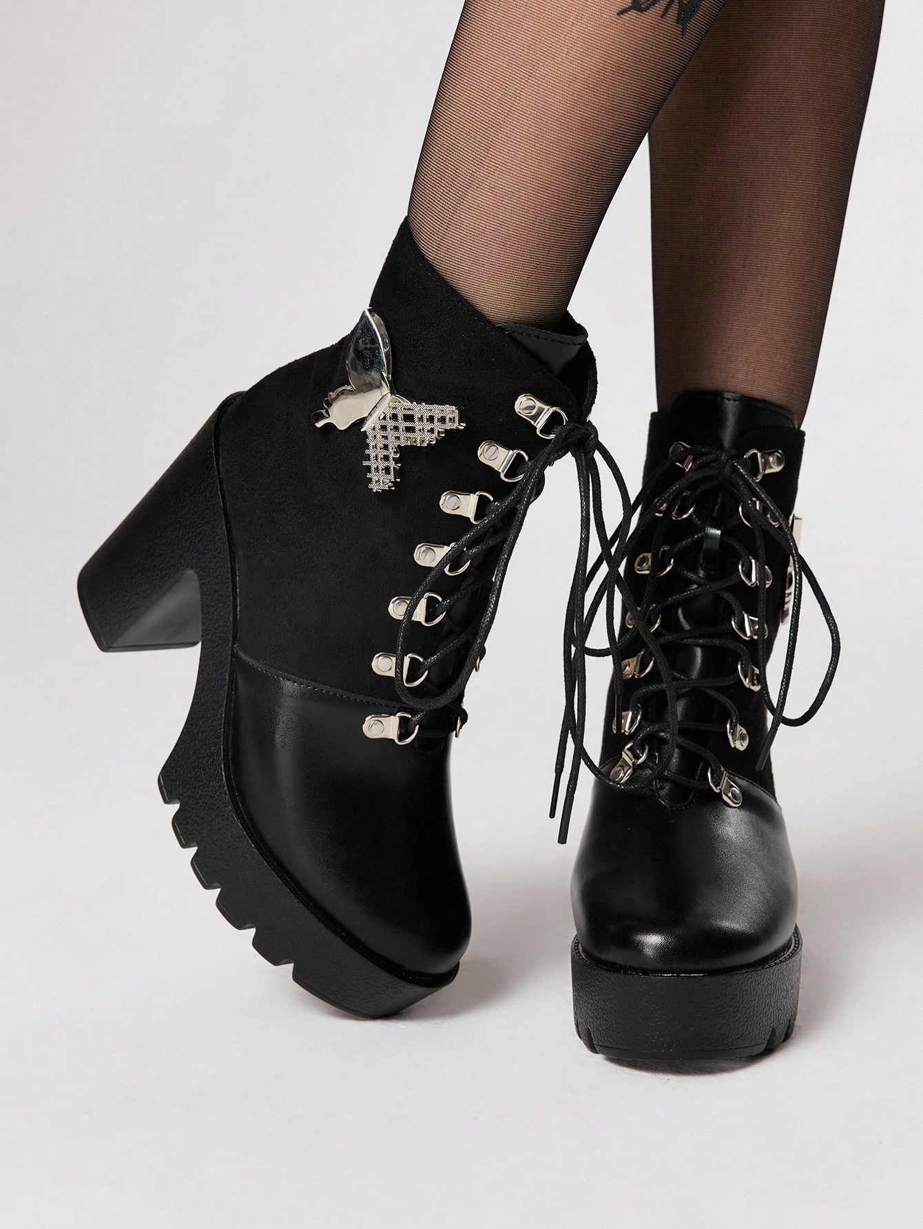 Kawaii Women's Gothic Style Round Toe Chunky Heel Platform Punk Boots, Suede & PU Leather Patchwork, Black High Heel Boots Suitable For Party, Daily Wear, Height Increasing And Leg Lengthening, Halloween