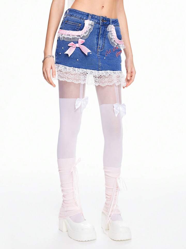 Kawaii Women's Himekaji Valentine's Day Lace Trim Bow Decor Tight-Fitting Pencil Denim Skirt
