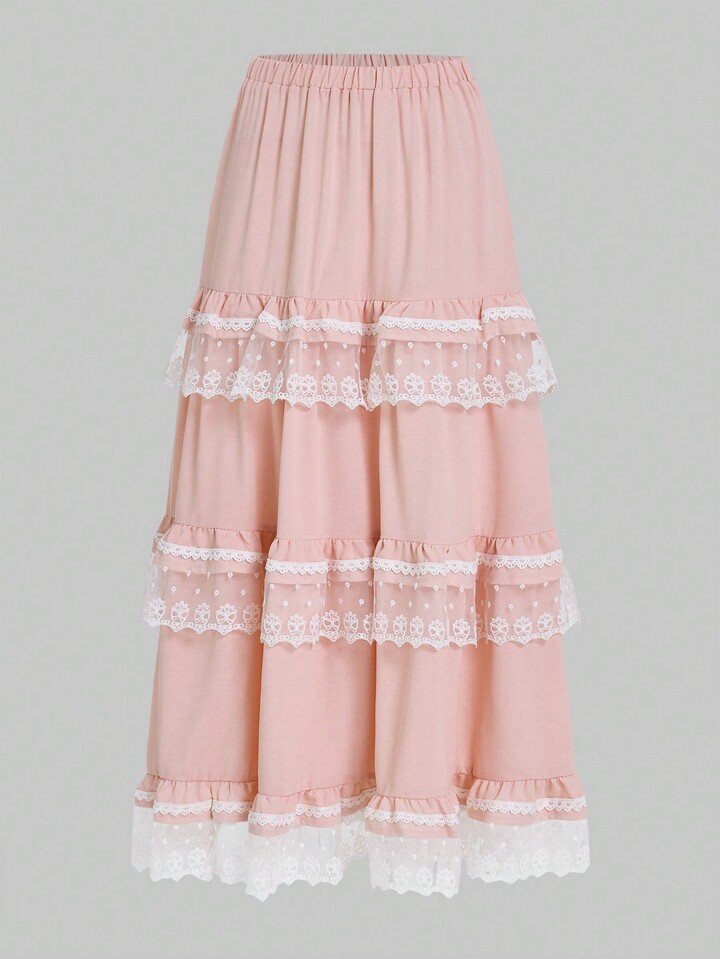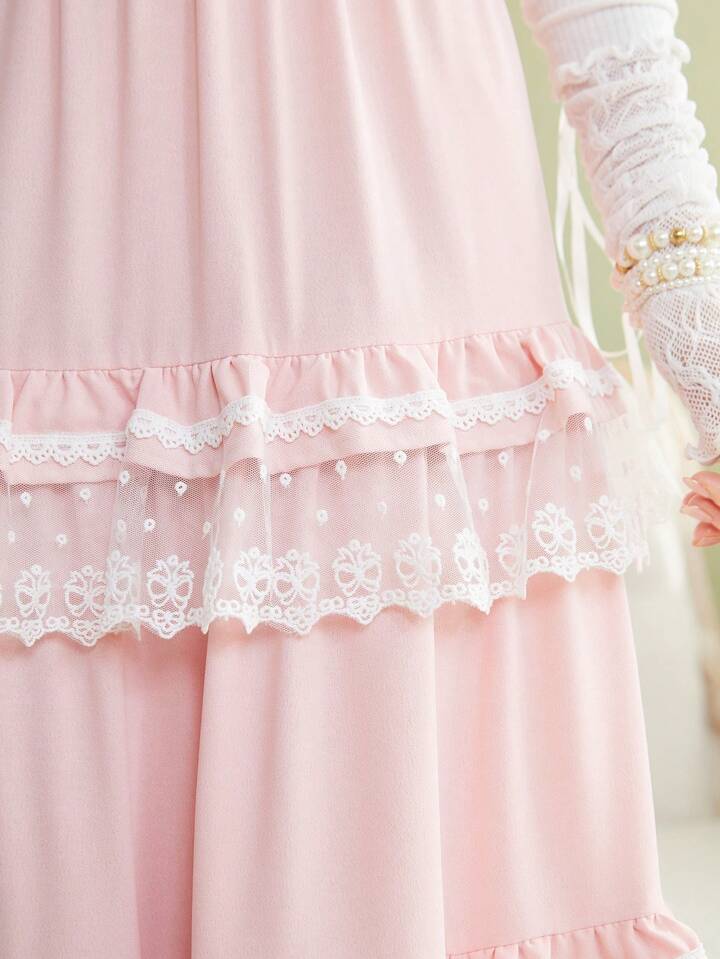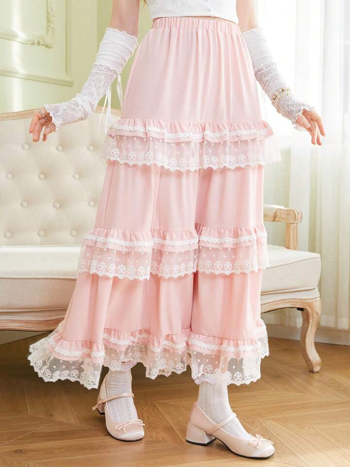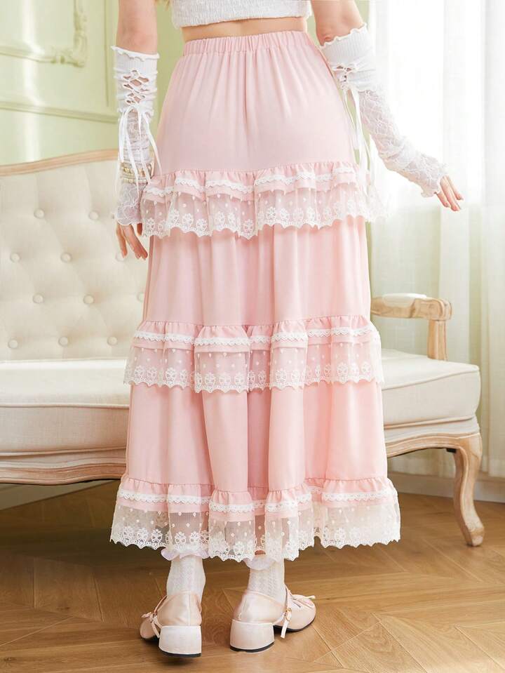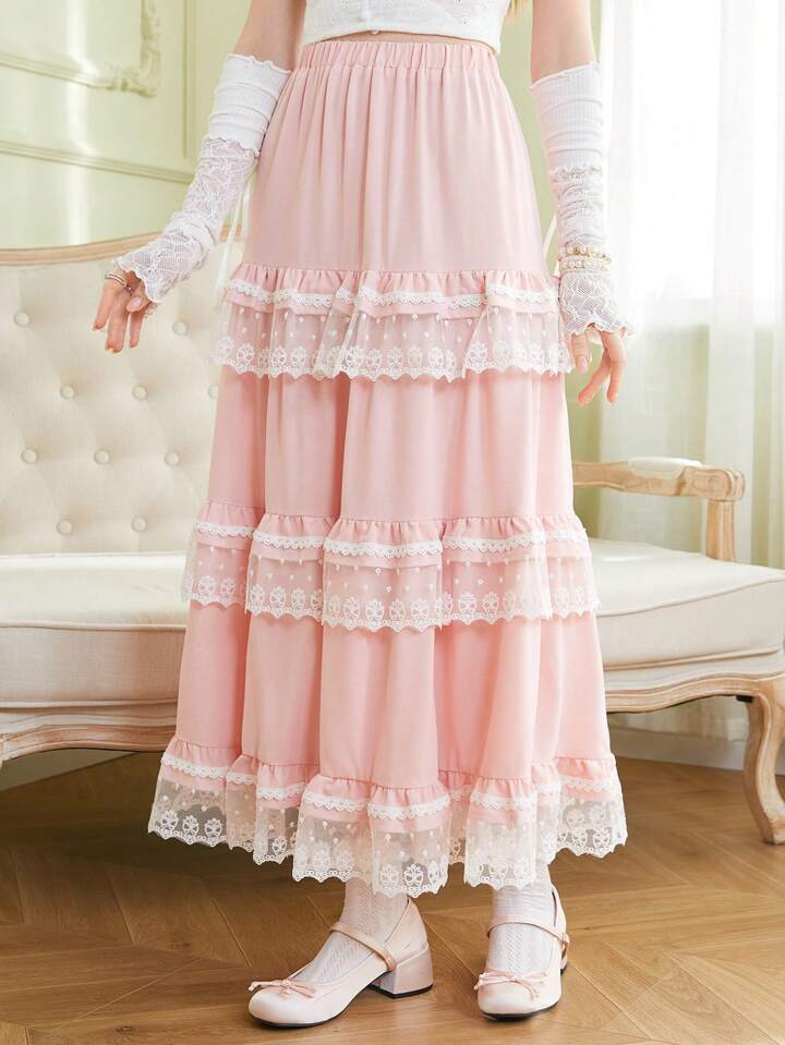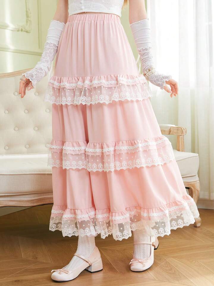 Kawaii Women's Lace Patchwork Multi-Layered Ruffled Hem Skirt