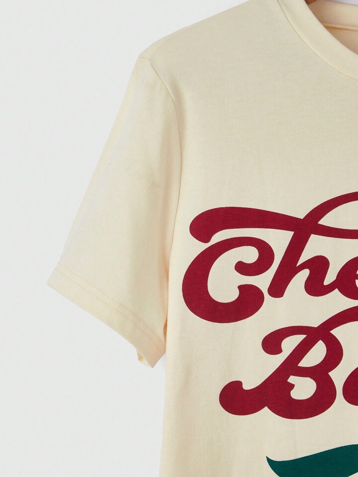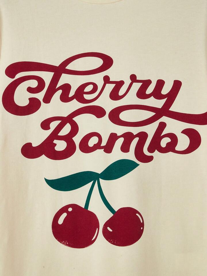 Kawaii Women's Letter & Cherry Printed Short Sleeve T-Shirt Cherry Bomb