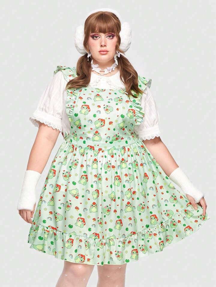 Kawaii Women's Plus Size Cartoon Print Lace Trim Dress (shirt Not Included)