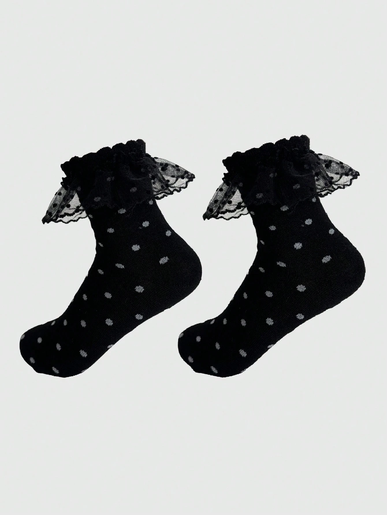 Kawaii Women's Polka Dot Pattern Mesh Splice Ruffle Trim Cute Crew Socks