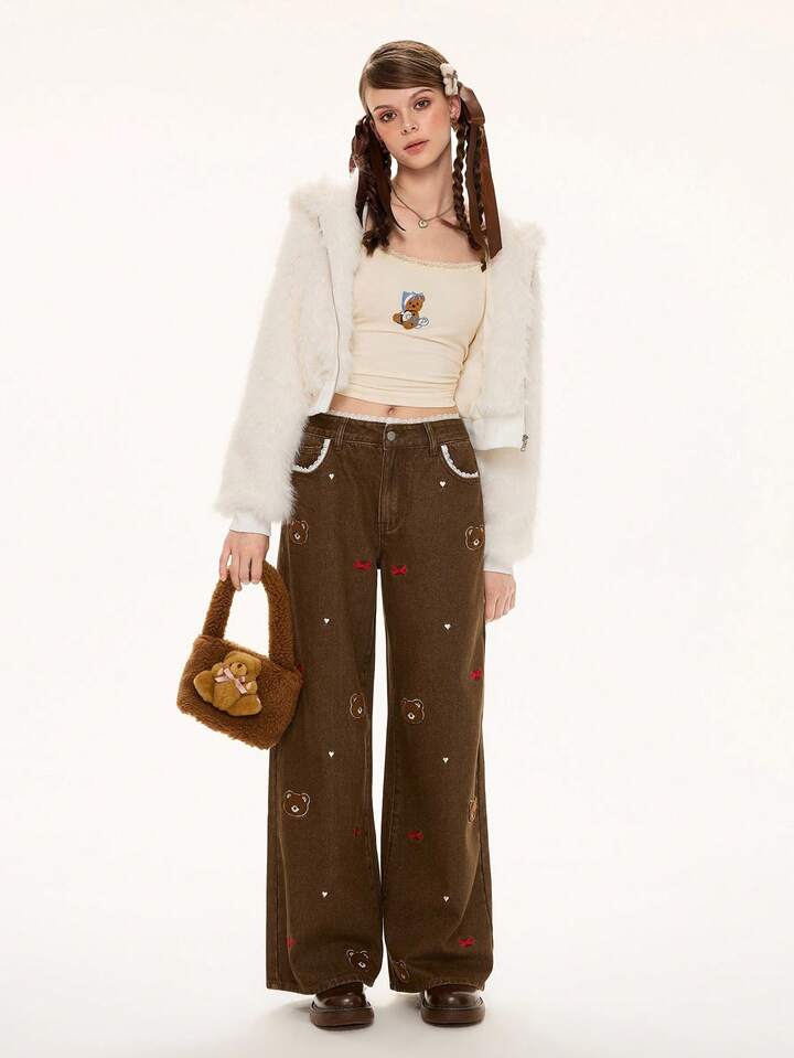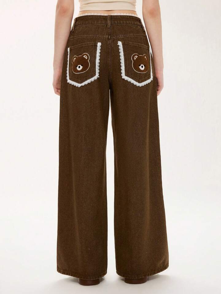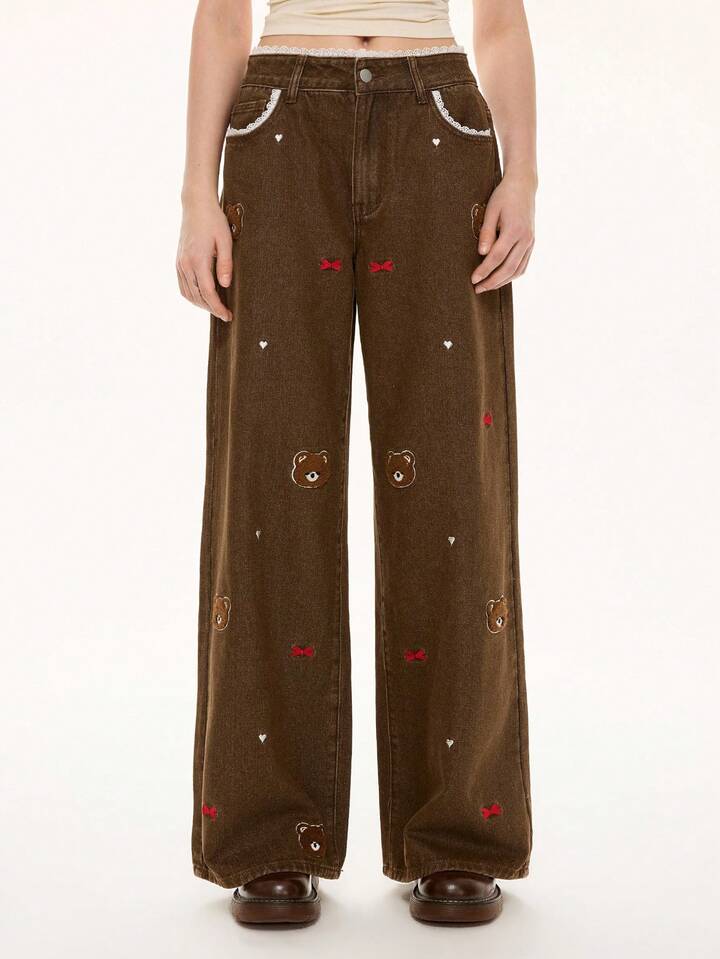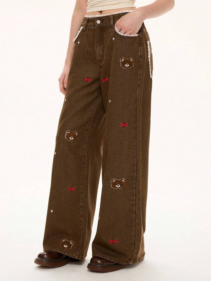 Kawaii Women's Retro Cute Bear & Bow Embroidered Lace Patchwork Super Low Waist Straight Leg Jeans