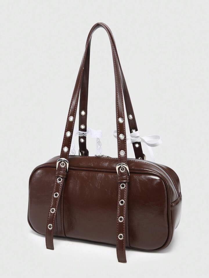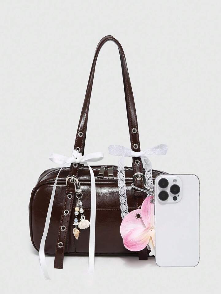 Kawaii Women's Retro Cute Plaid, Seashell, Bowknot Decor Shoulder Armpit Bag With Multiple Pockets, Boston Style Handbag