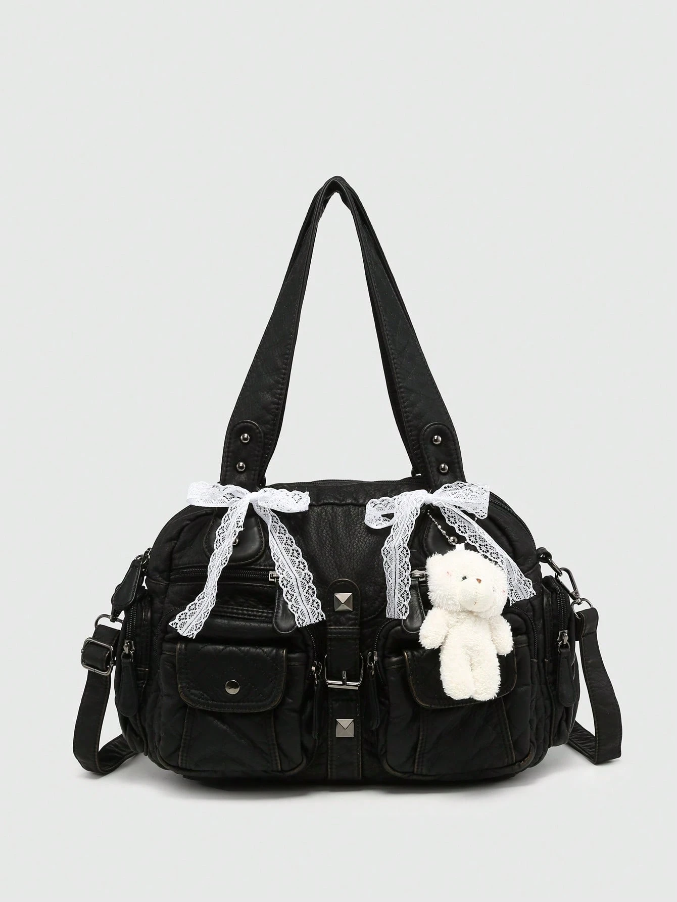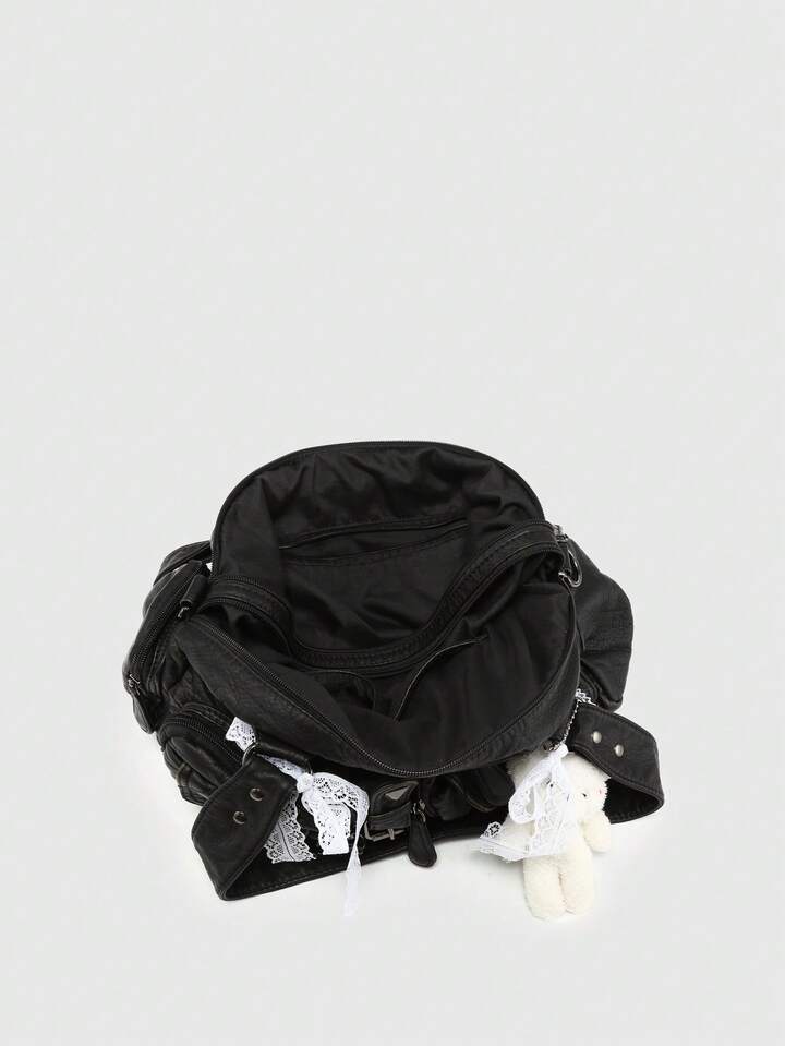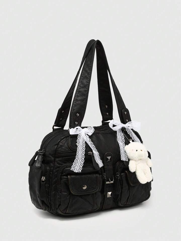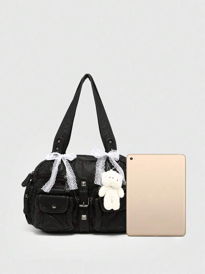 Kawaii Women's Retro Distressed Gradient Cross & Heart Pendant Decoration Bowknot Strap Tote Bag, Large Capacity Shoulder Bag With Multiple Pockets