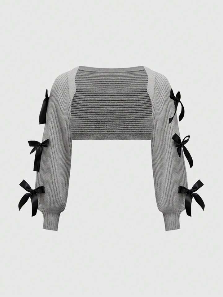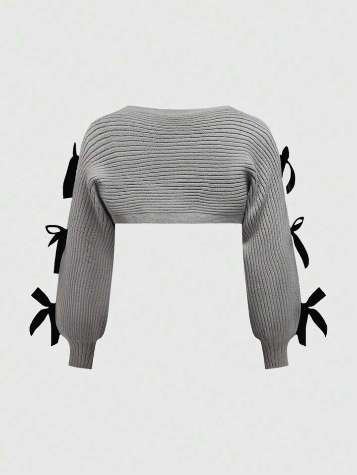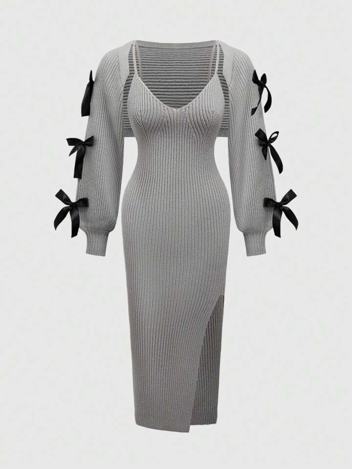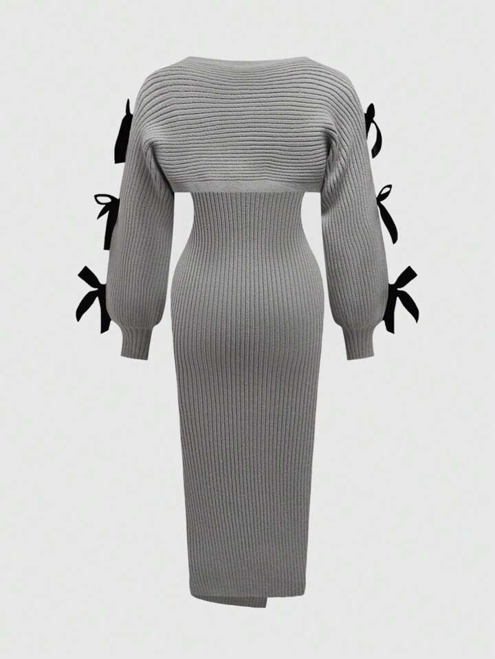 Kawaii Women's Sexy Split Ribbed Knit Flounced Bowknot Collar Mini Dress, Academic Style, Bodycon Mermaid Silhouette