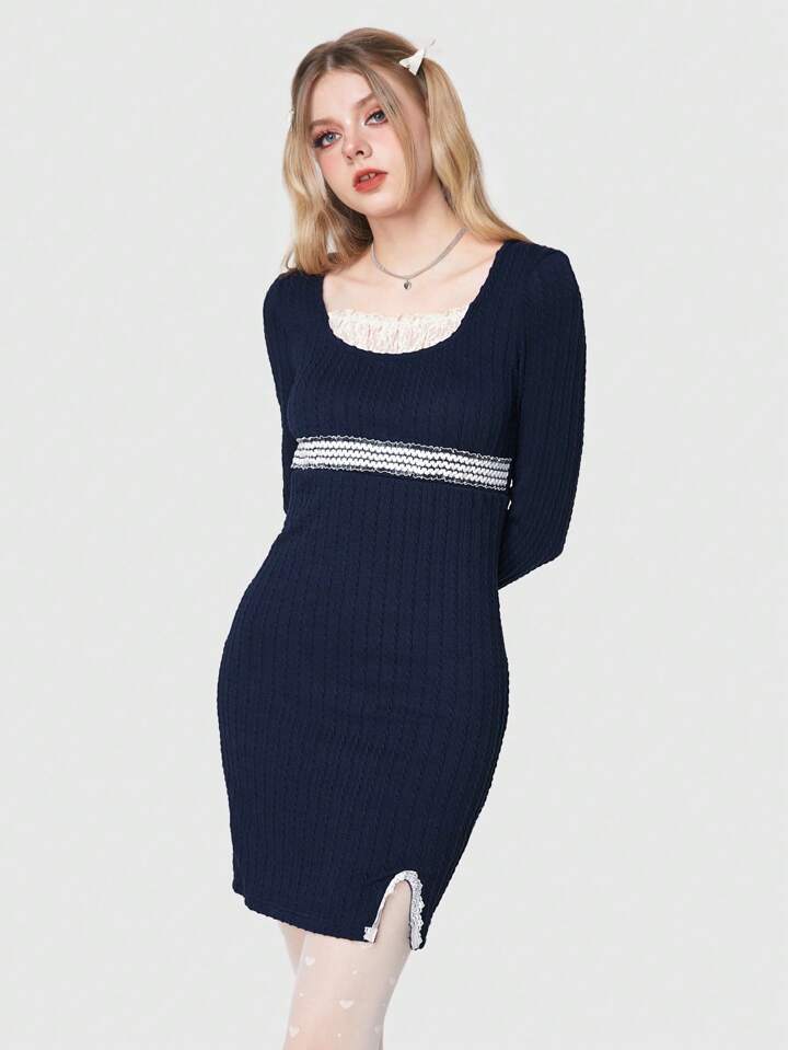 Kawaii Women's Striped Ribbon Lace Trim Dress