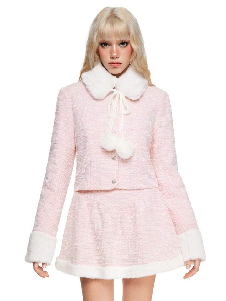 Kawaii Women's Sweet Style Fuzzy Trim Button Front Jacket & Skirt Set