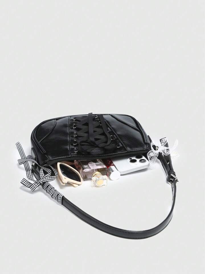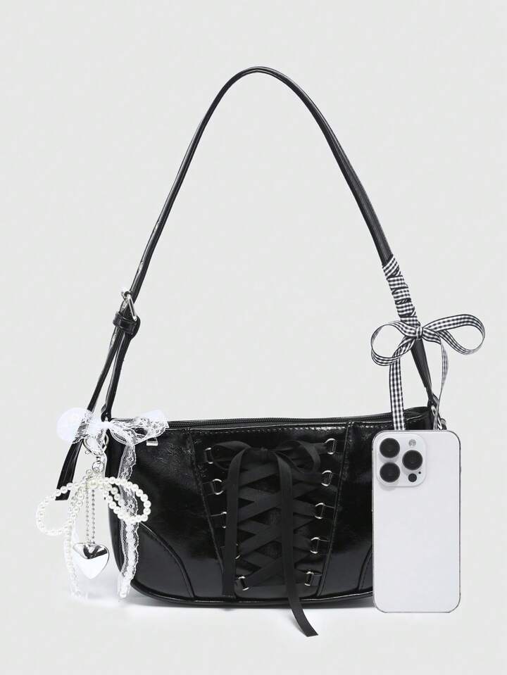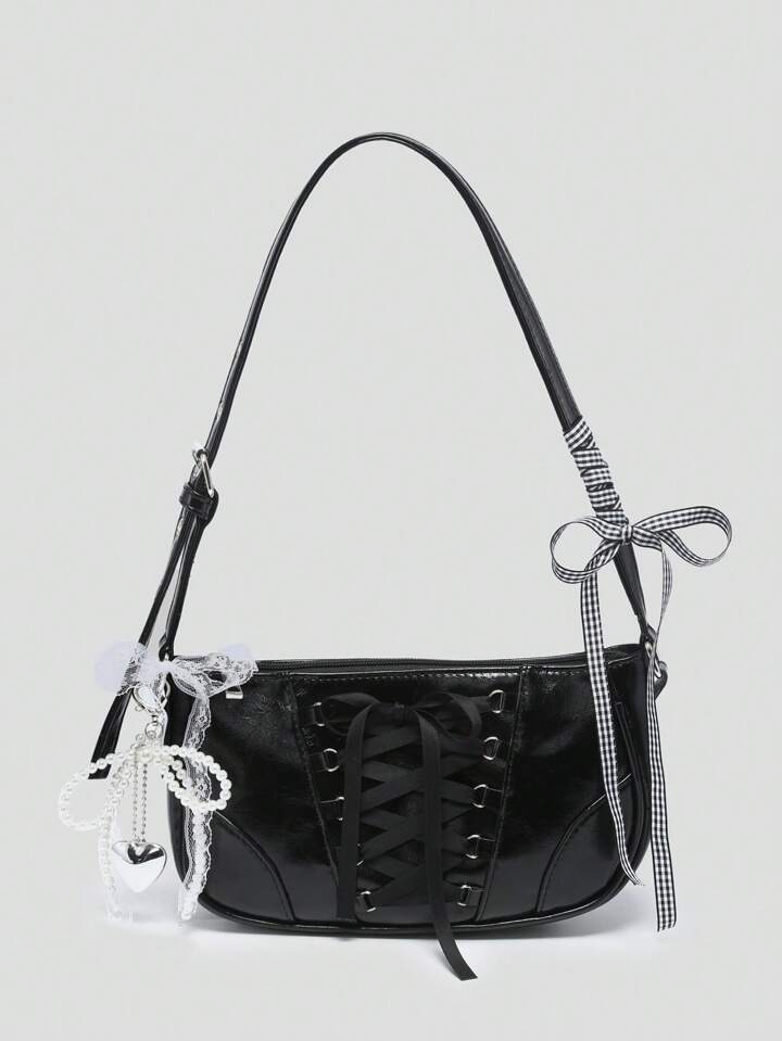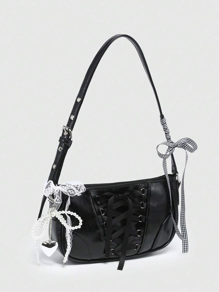 Kawaii Women's Vintage Ballet Style Bowknot Chain & Pearl Lace Decor Shoulder Underarm Baguette Bag