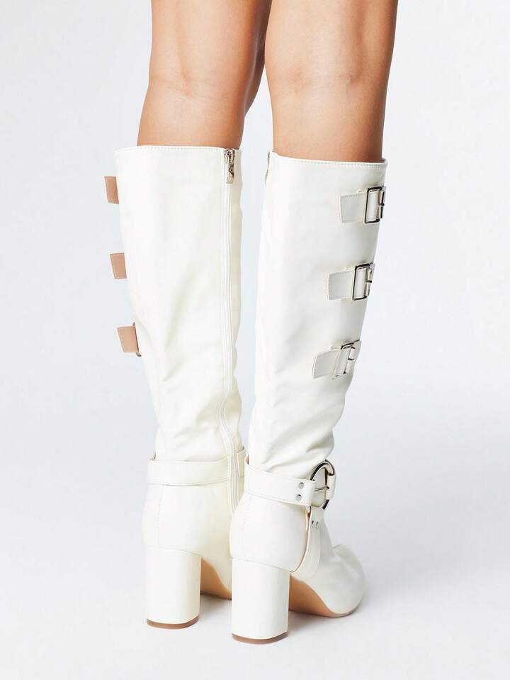Kawaii Women's White Buckle Pointed Toe Low Heel Mid-Calf Boots