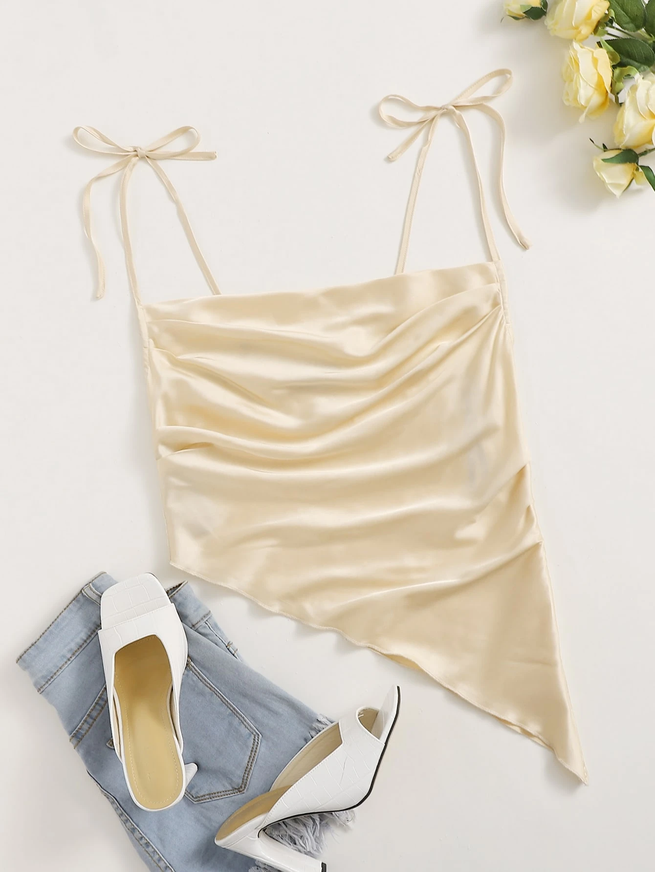 Knot Straps Ruched Asymmetrical Hem Satin Cami Top