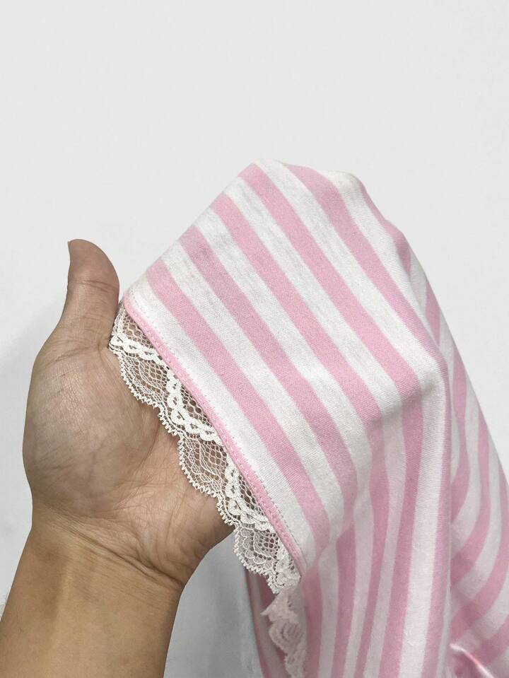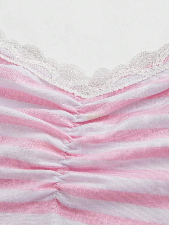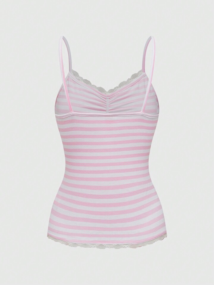 Lace Trimmed Pink Striped & Floral Printed Camisole With Spaghetti Straps