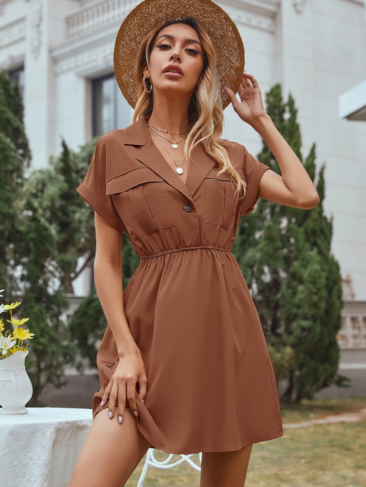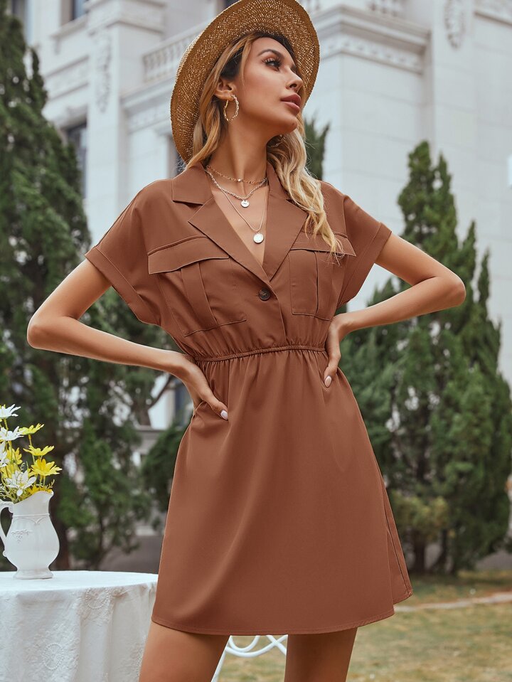 Lapel Collar Single Button Flap Pocket Shirt Dress