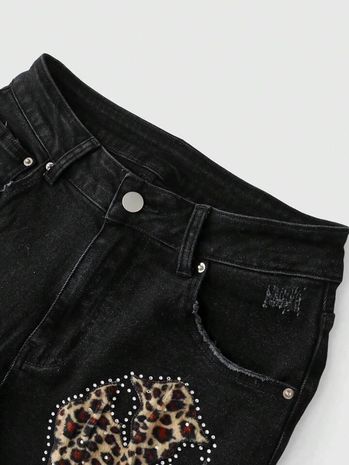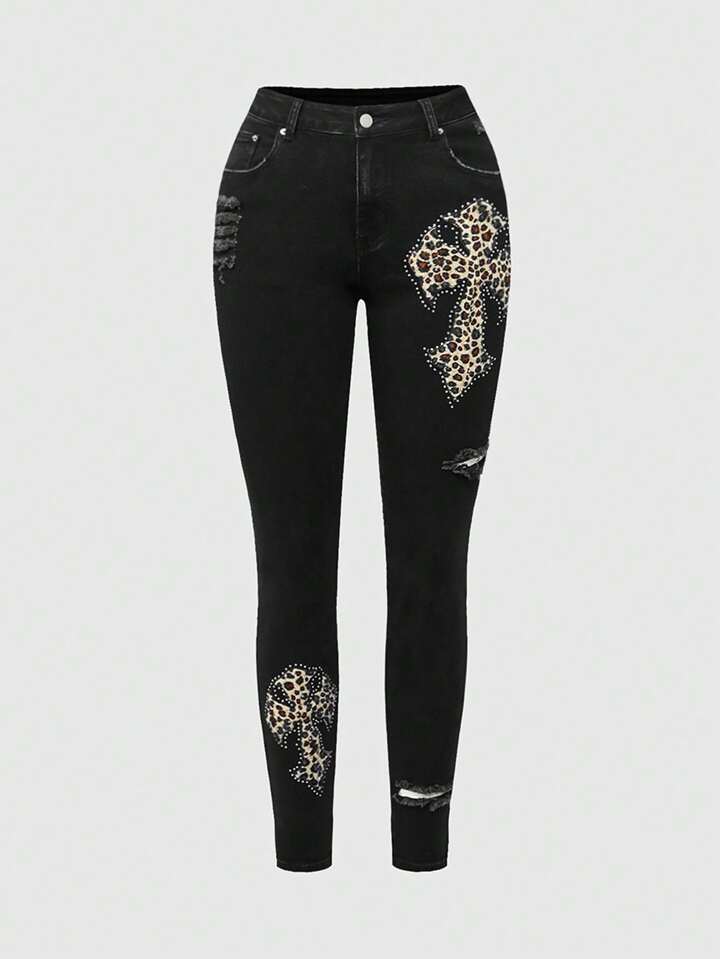 Leopard Print Cross Embroidered Rhinestone Distressed Black Denim Jeans