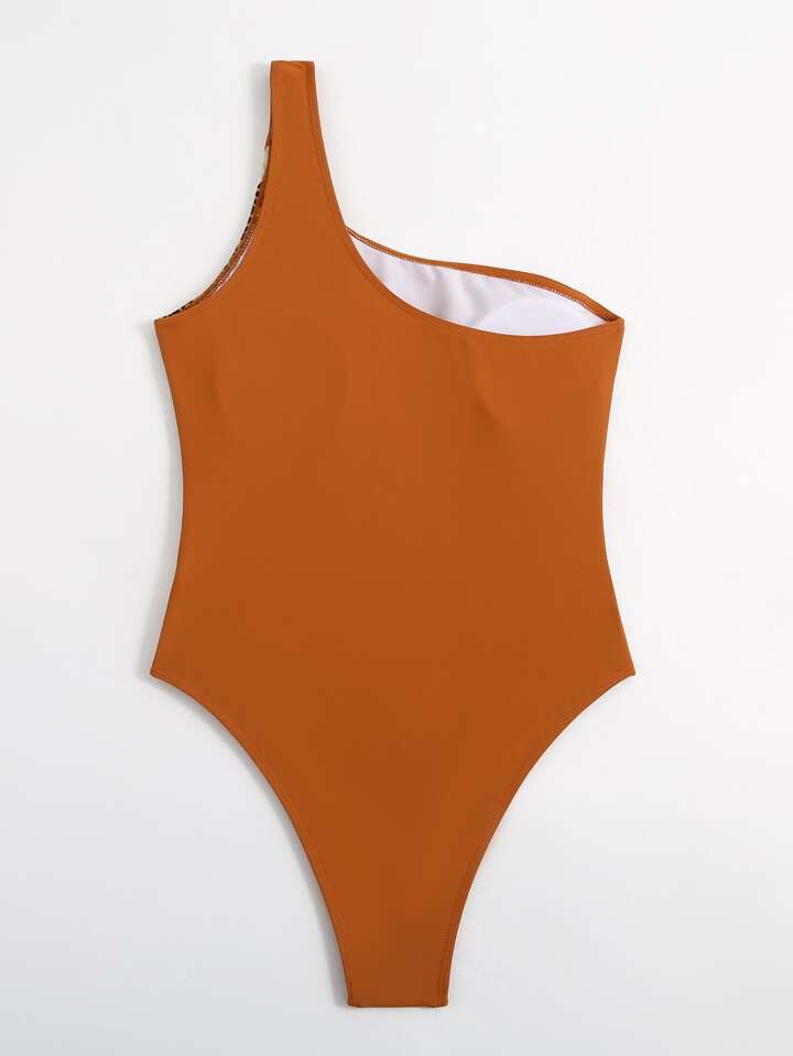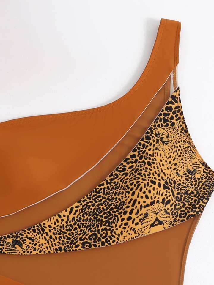 Leopard Print Sheer Mesh Insert One Shoulder One Piece Swimsuit