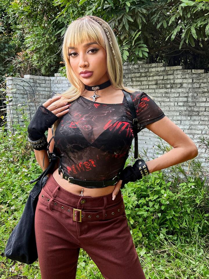 Letter Graphic Asymmetrical Neck Mesh Top Without Bra
