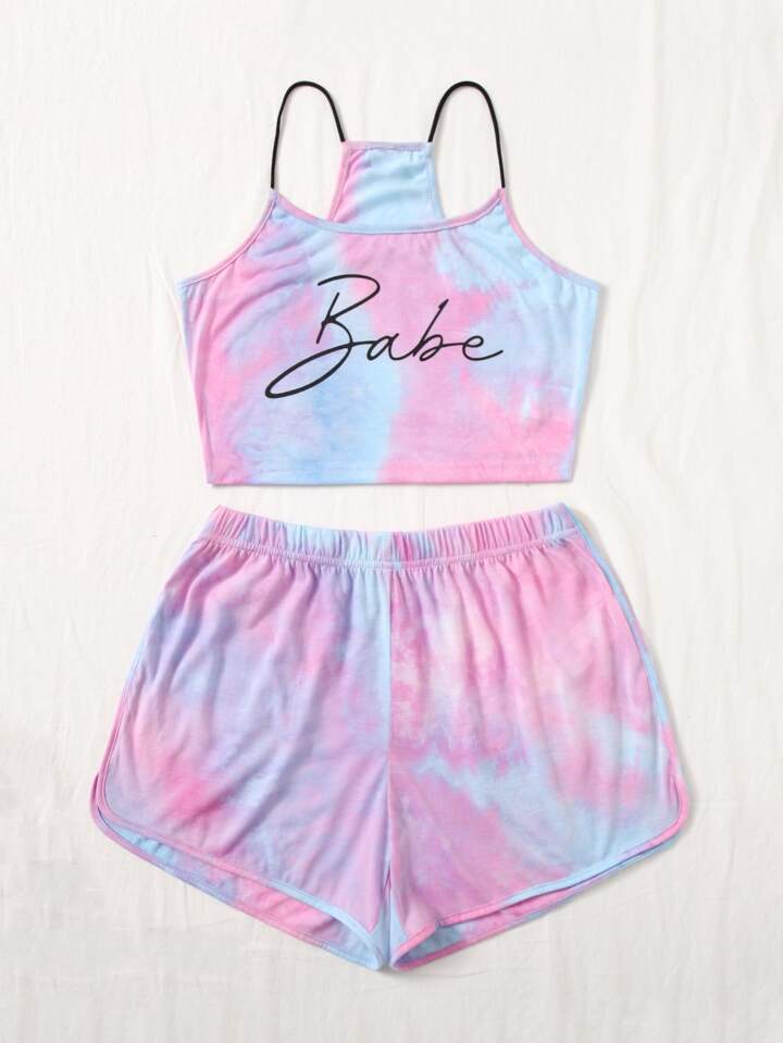 Letter Graphic Tie Dye Cami Top & Dolphin Shorts Set