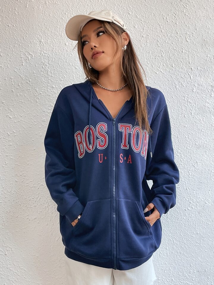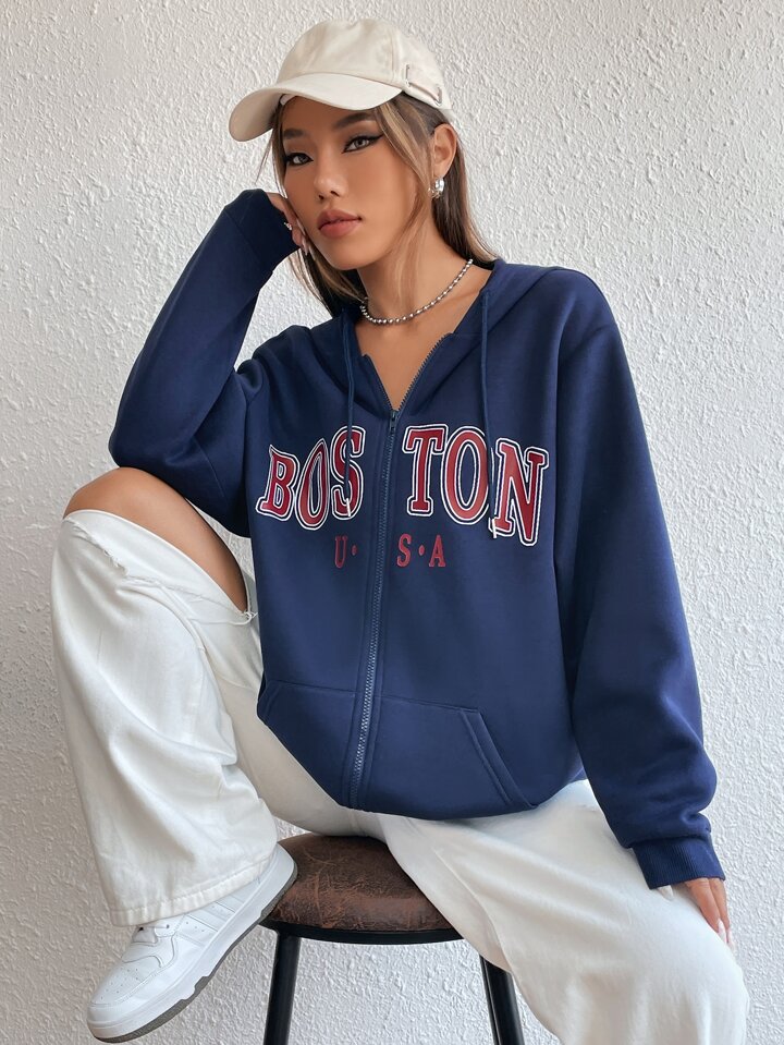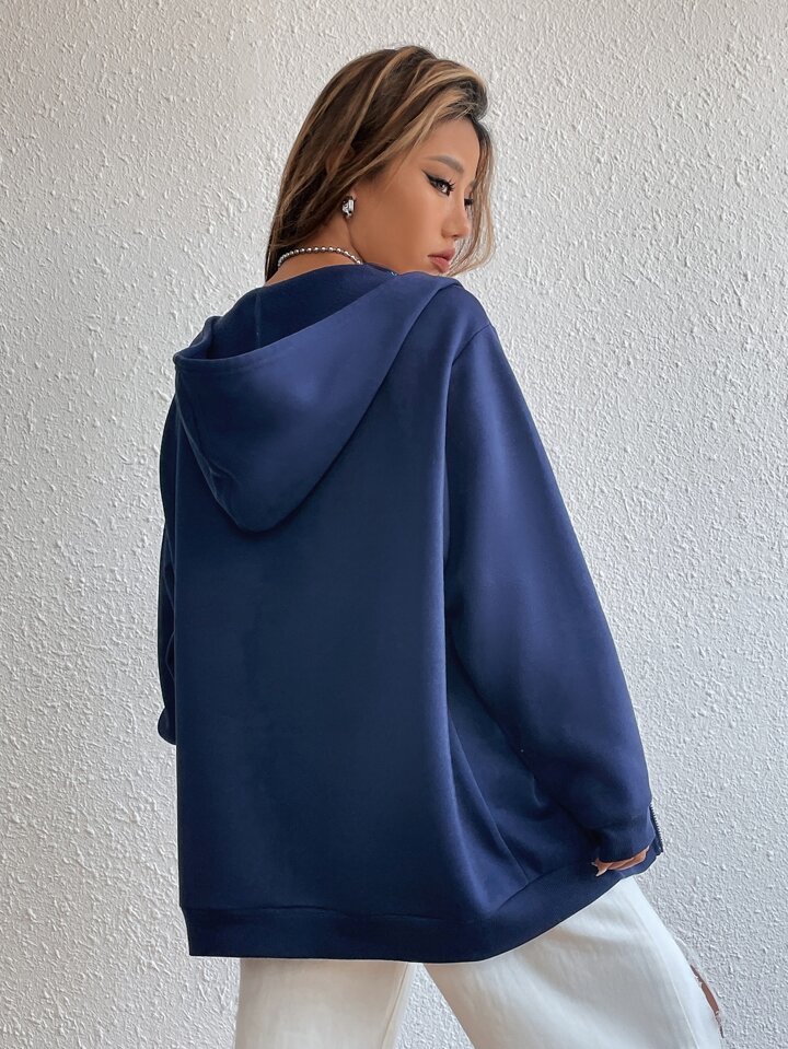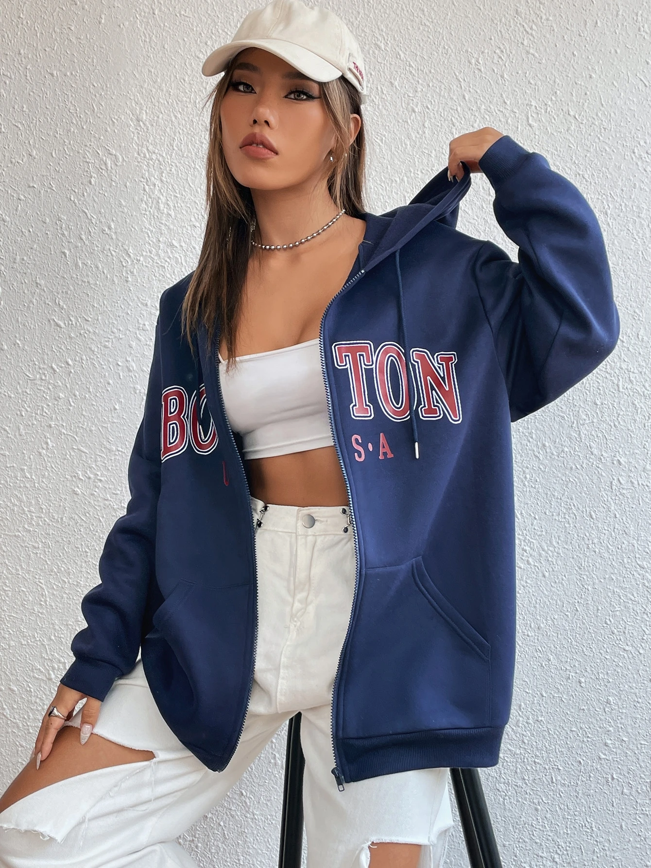 Letter Graphic Zip Up Drop Shoulder Drawstring Thermal Lined Hoodie