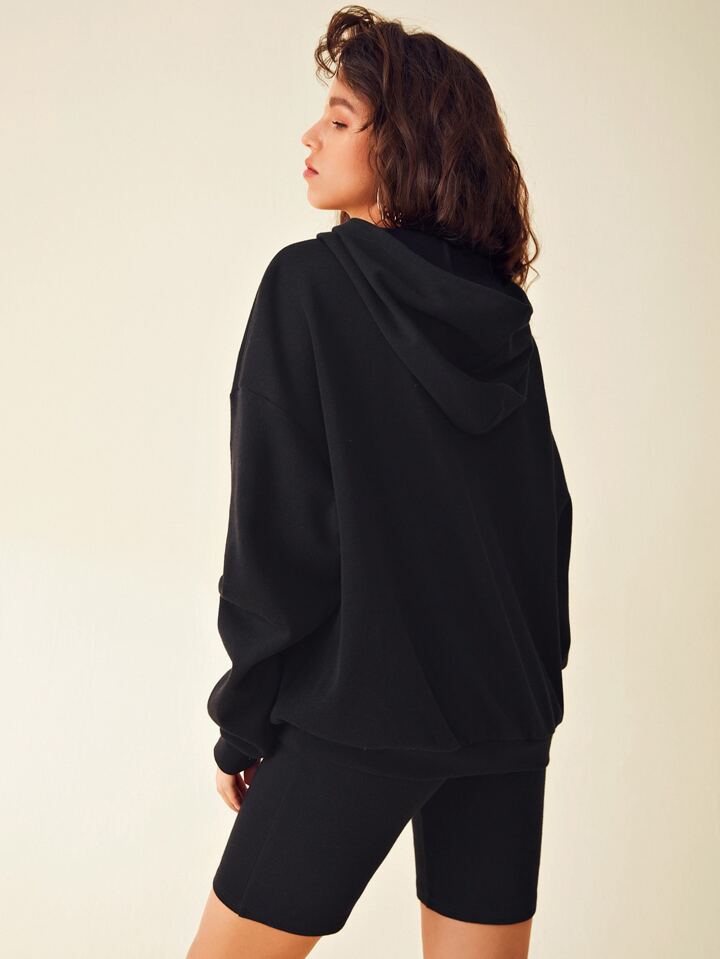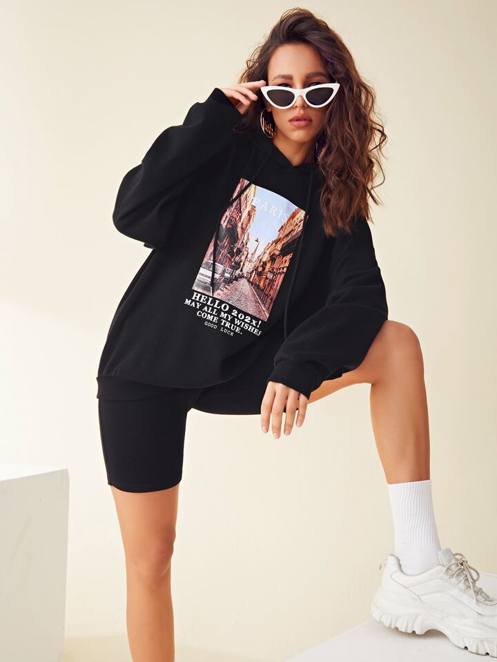 Letter and Graphic Print Hoodie & Biker Shorts Set