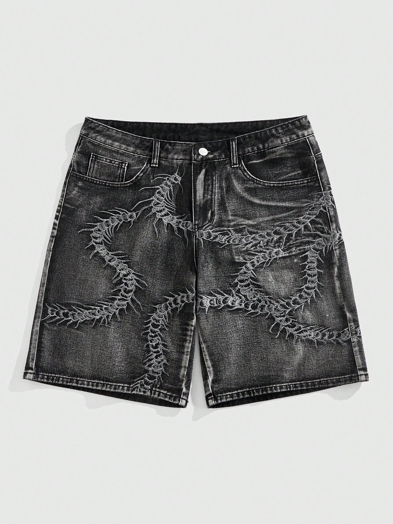 Anime Men's Centipede Print Baggy Embroidery Denim Shorts