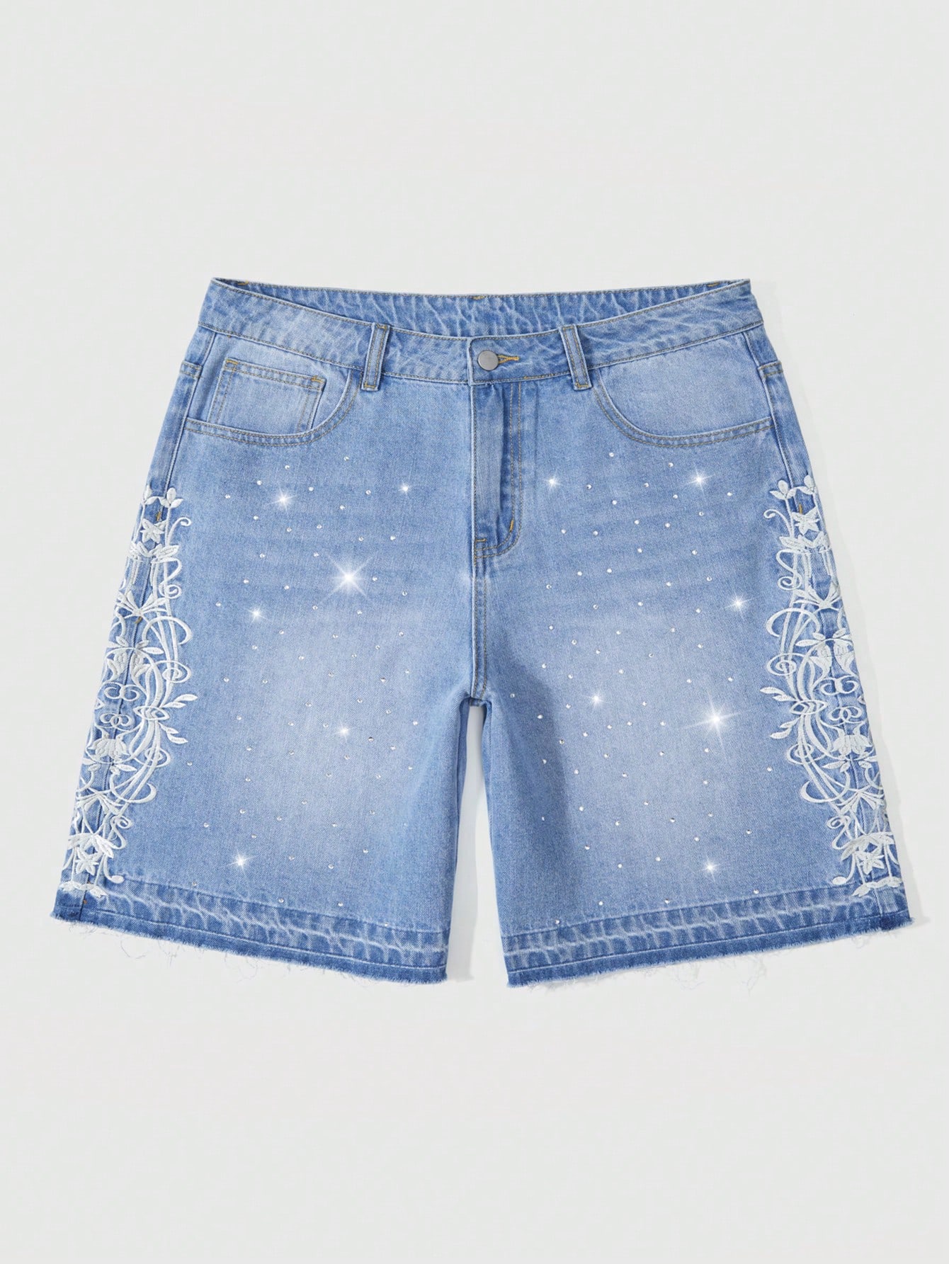 Street Life Men's Street Life Washed Denim Shorts With Rhinestones Embroidery