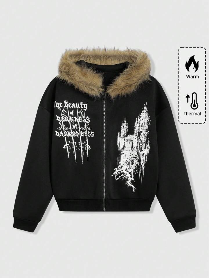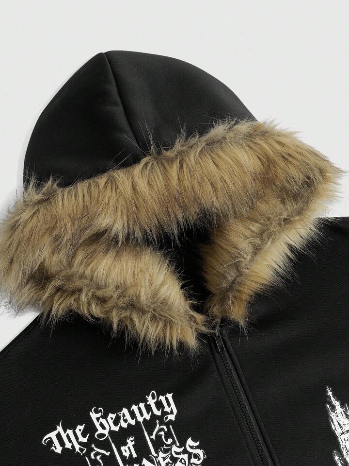 Men's Gothic Autumn/Winter Slogan Castle Pattern Fleece Hooded Zip-Up Casual Sweatshirt Fur Collar