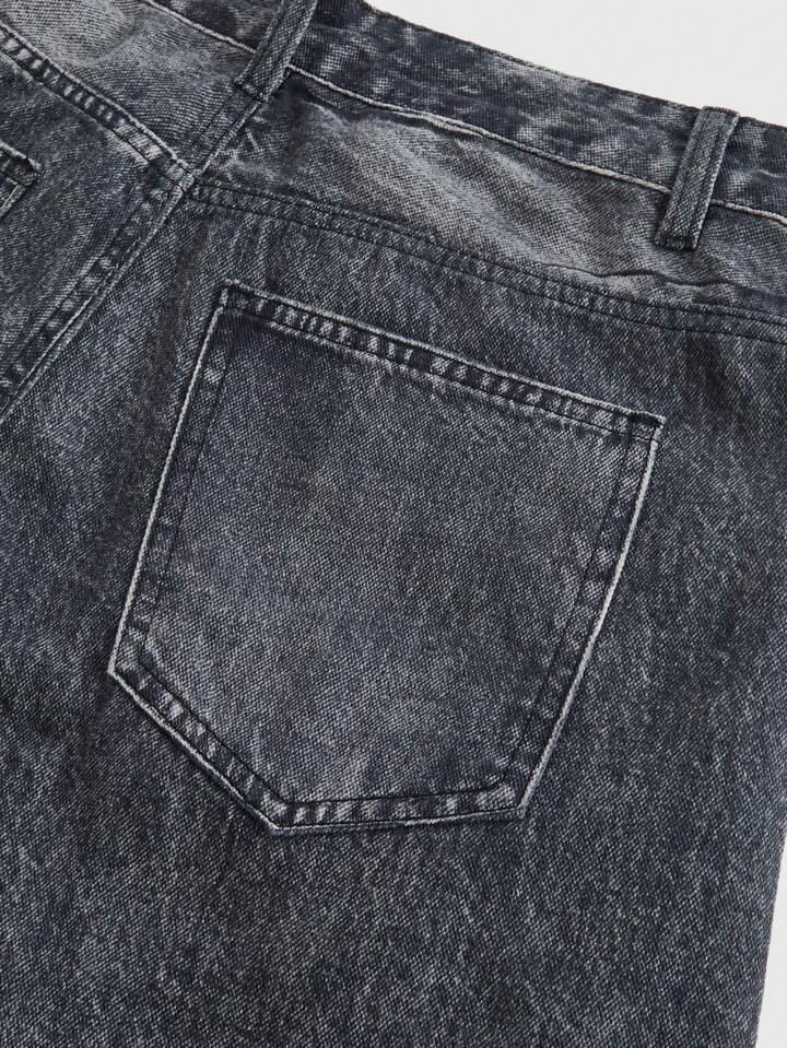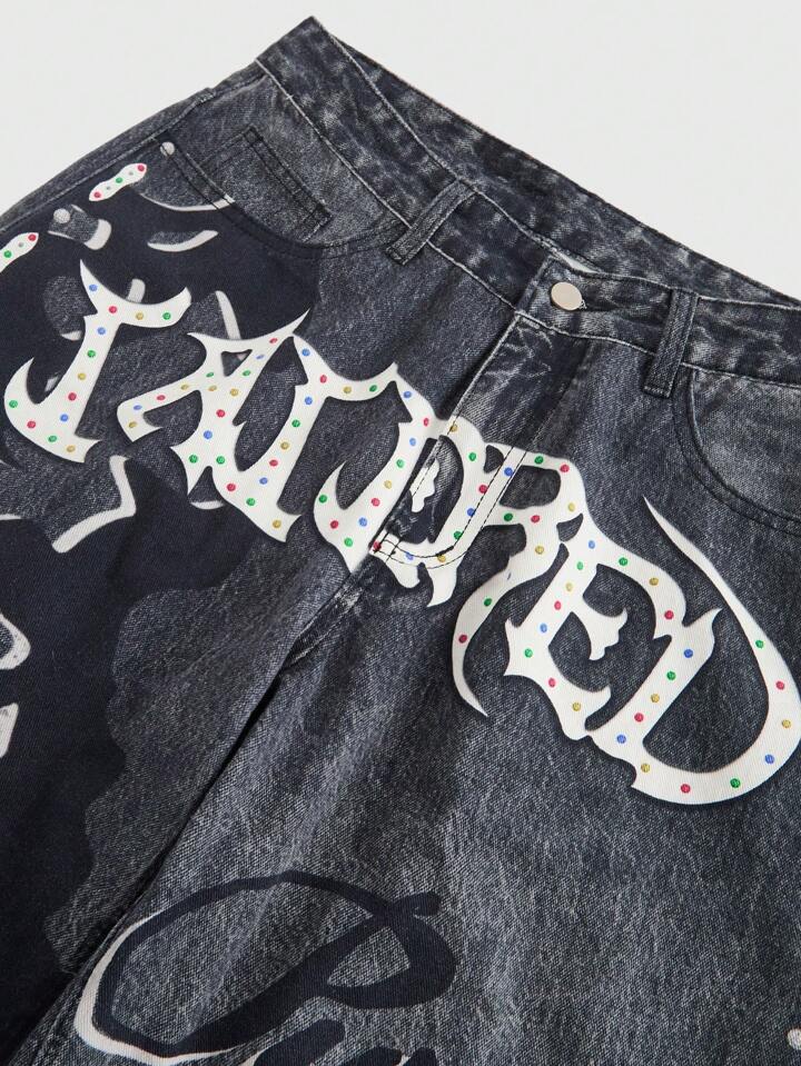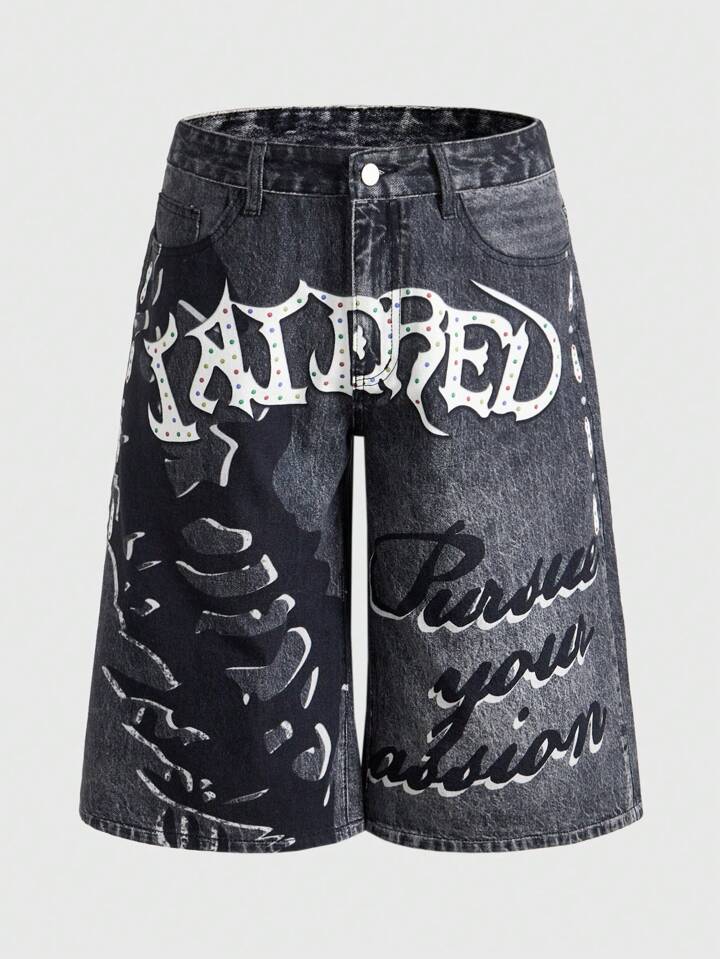 Men's Gothic Letter Print Pocket Loose Denim Shorts, Halloween