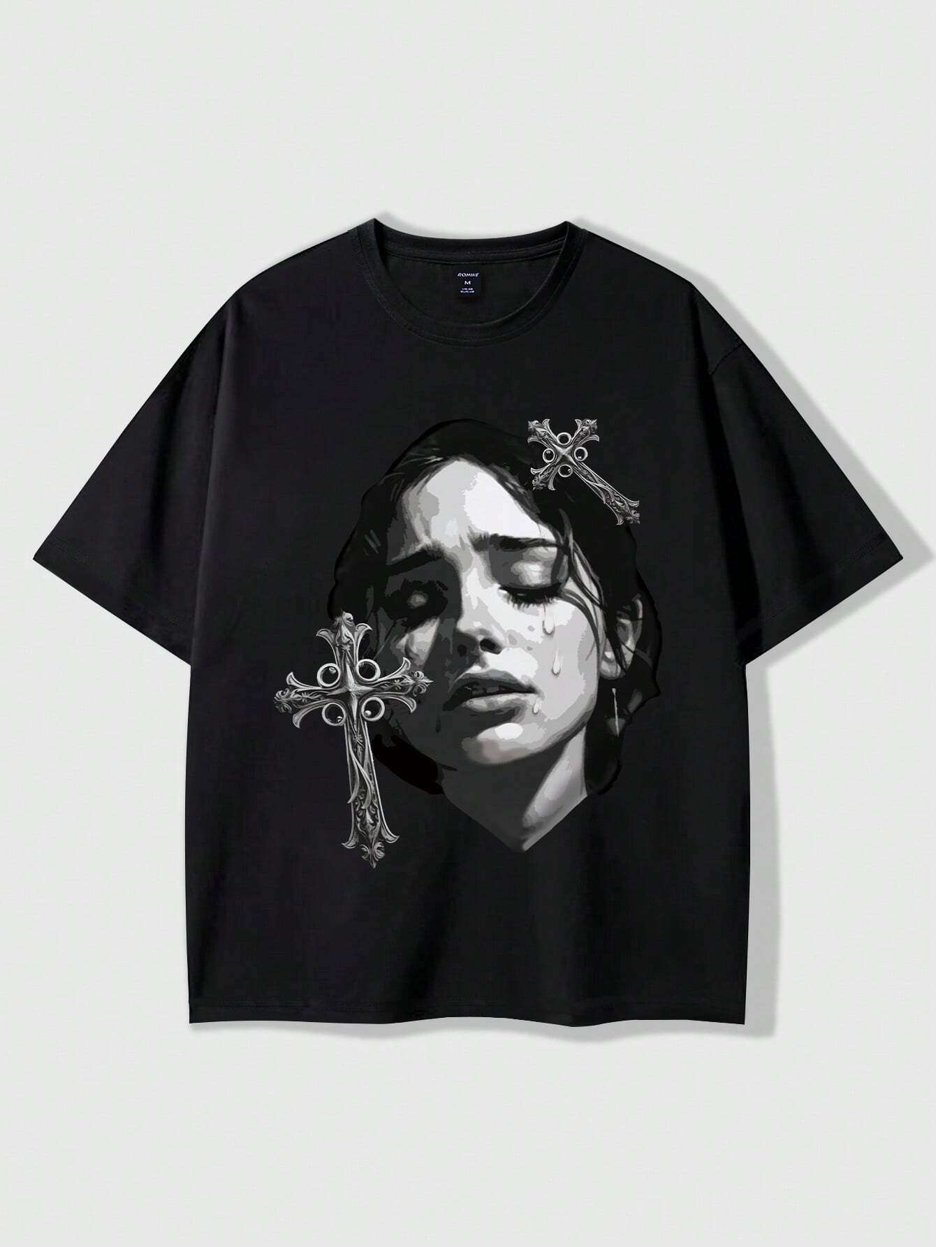 Men's High Street Vintage Round Neck T-Shirt Featuring Embossed Portrait Design, Suitable For Casual Wear In Spring And Summer