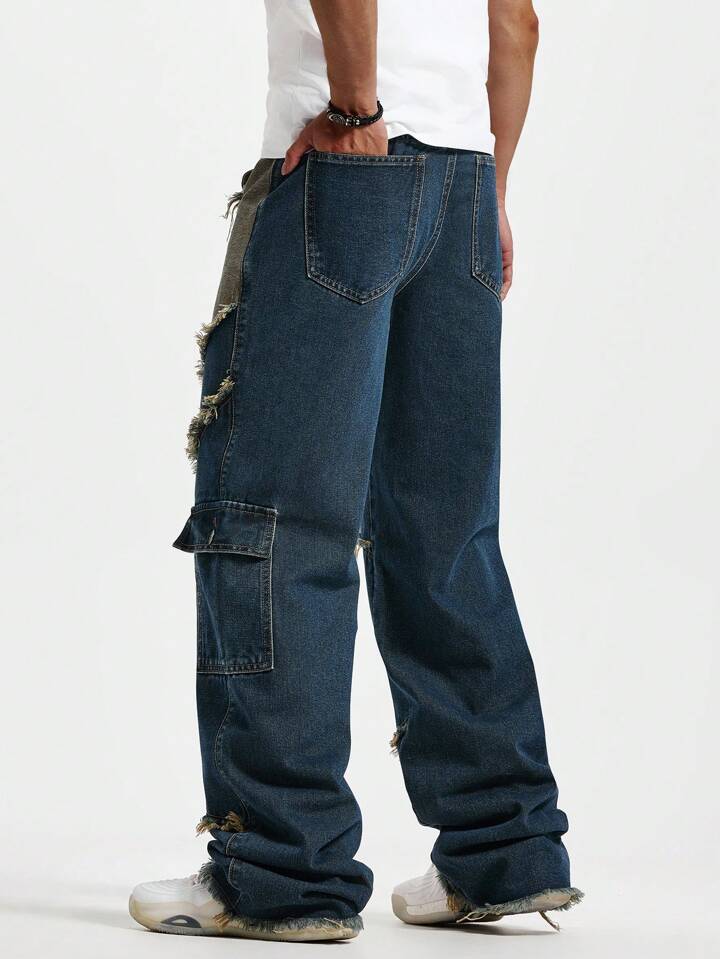 Men's Loose Fit Workwear Jeans With Frayed Hem Design
