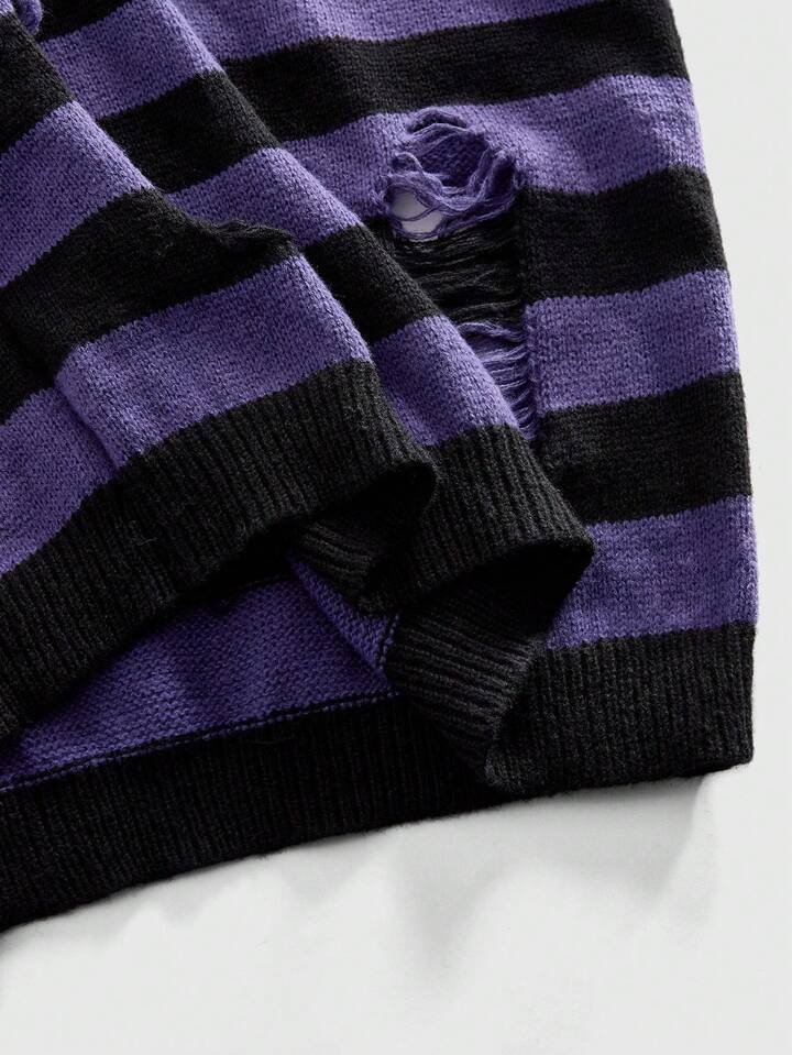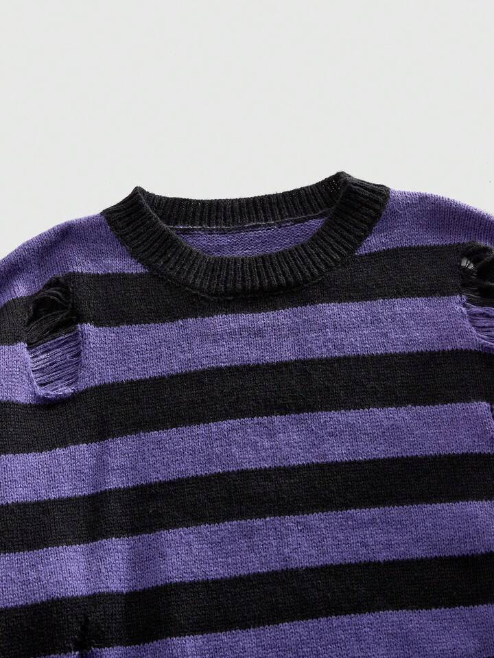 Men's Round Neck Striped Distressed Knit Sweater, Casual Street Style