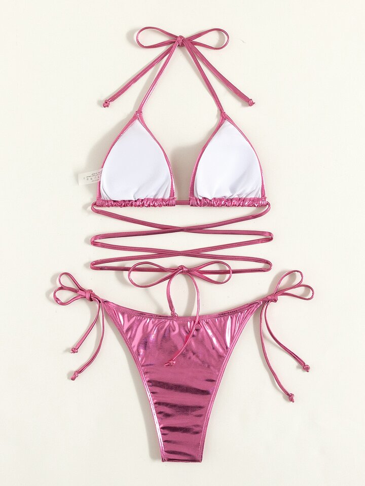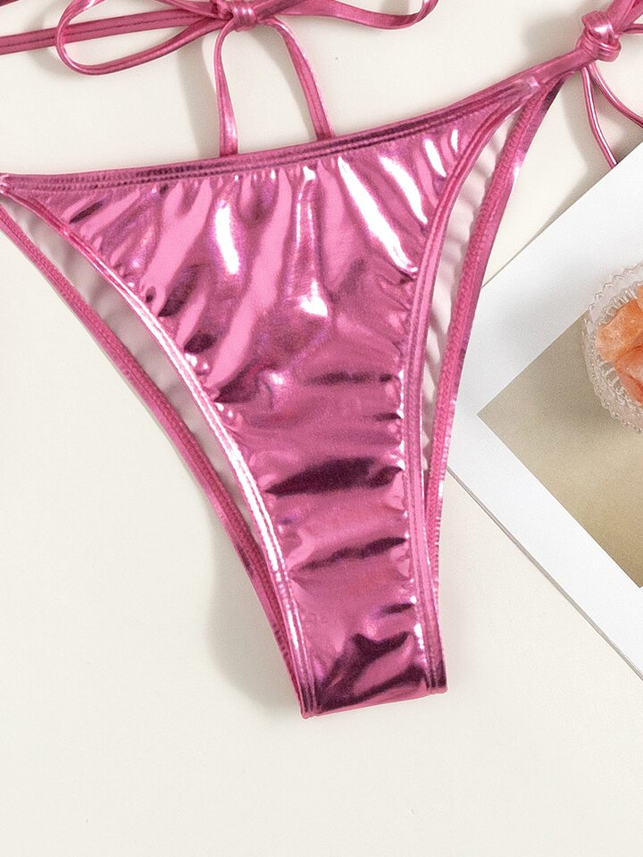 Metallic Triangle Tie Side Bikini, For Summer Beach Vacation