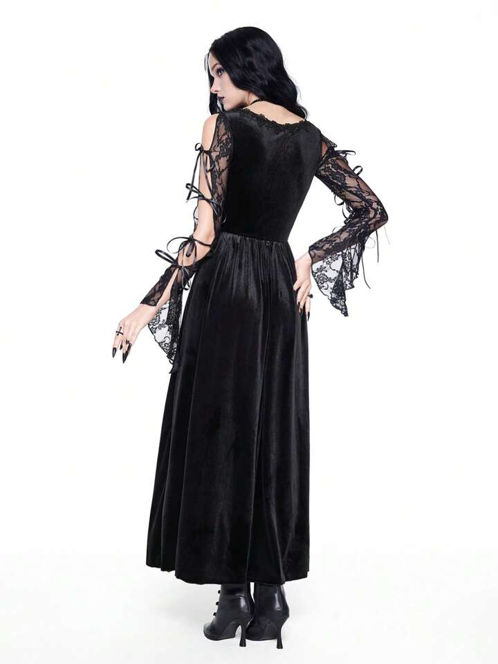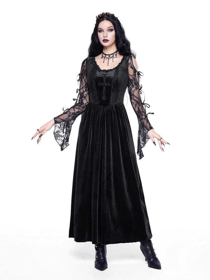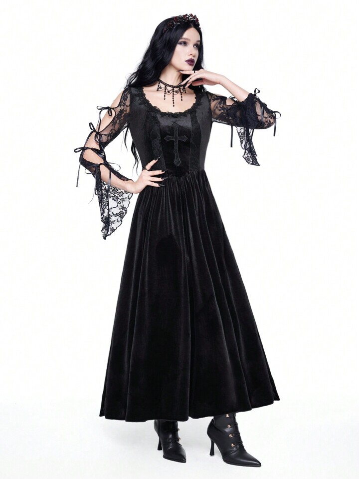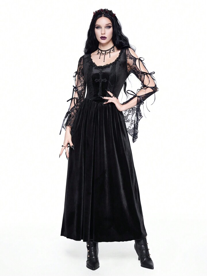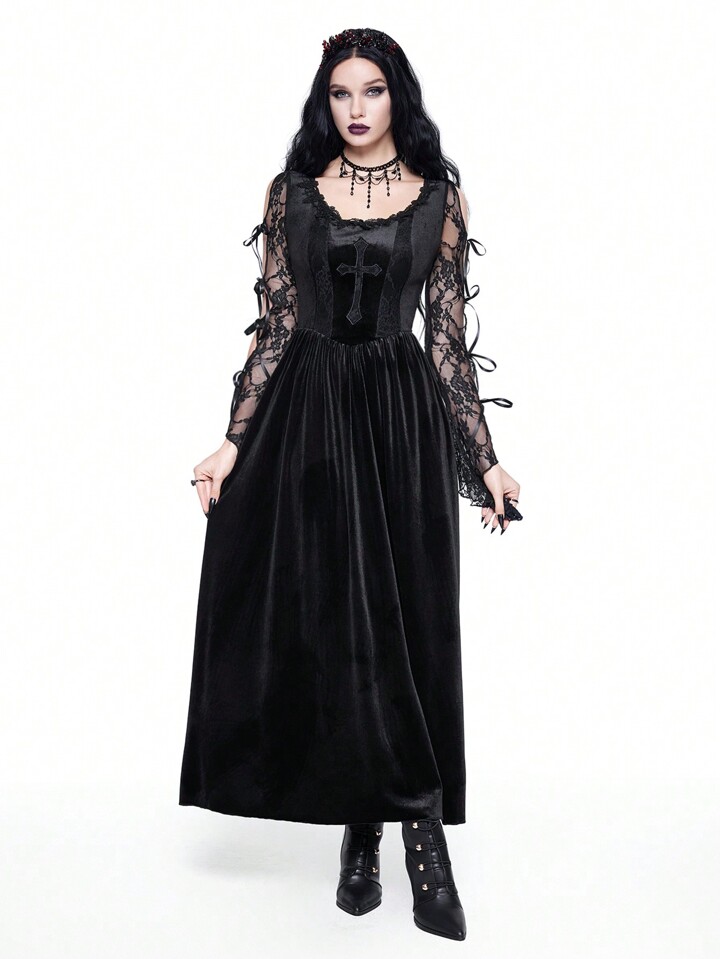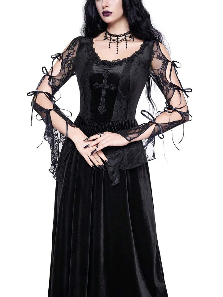 New Year's/Valentine's Day Black Velvet Gothic Palace-Style Sexy Contrast Lace Trim Cross Embroidery High-Low Dress For Women