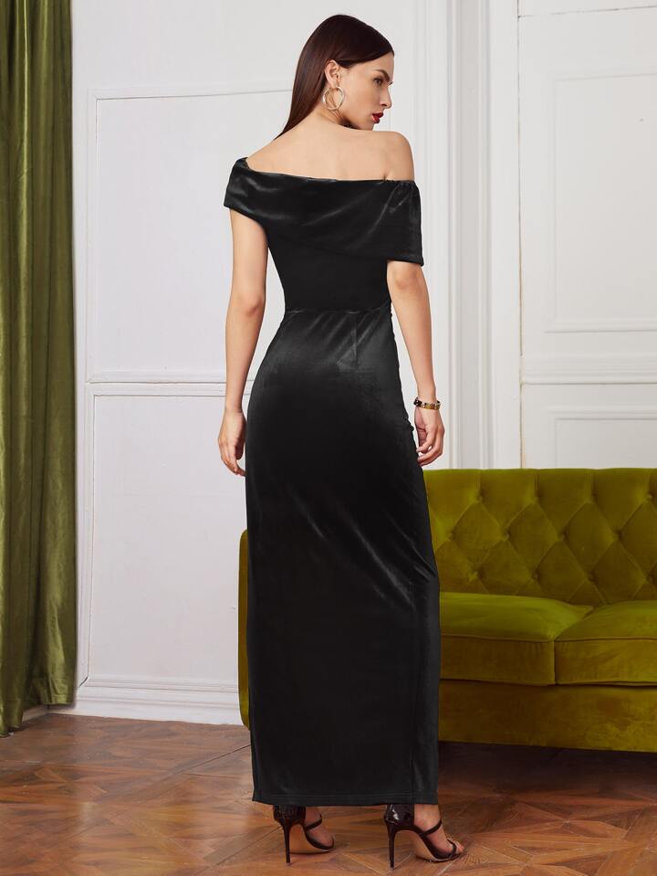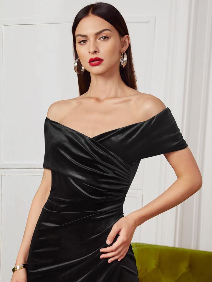 Off Shoulder Wrap Ruched Detail Velvet Dress