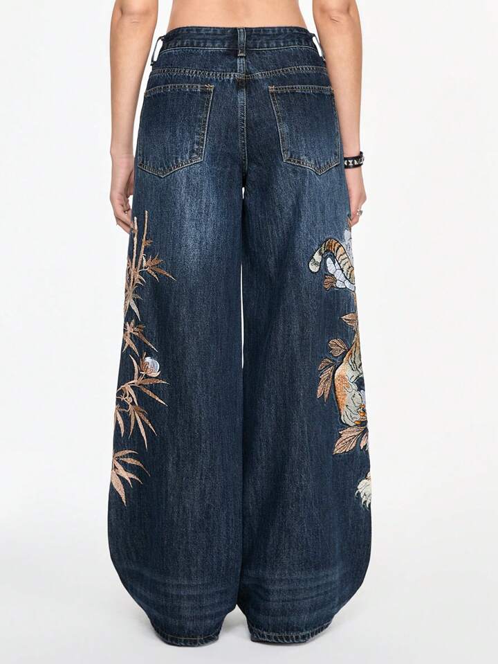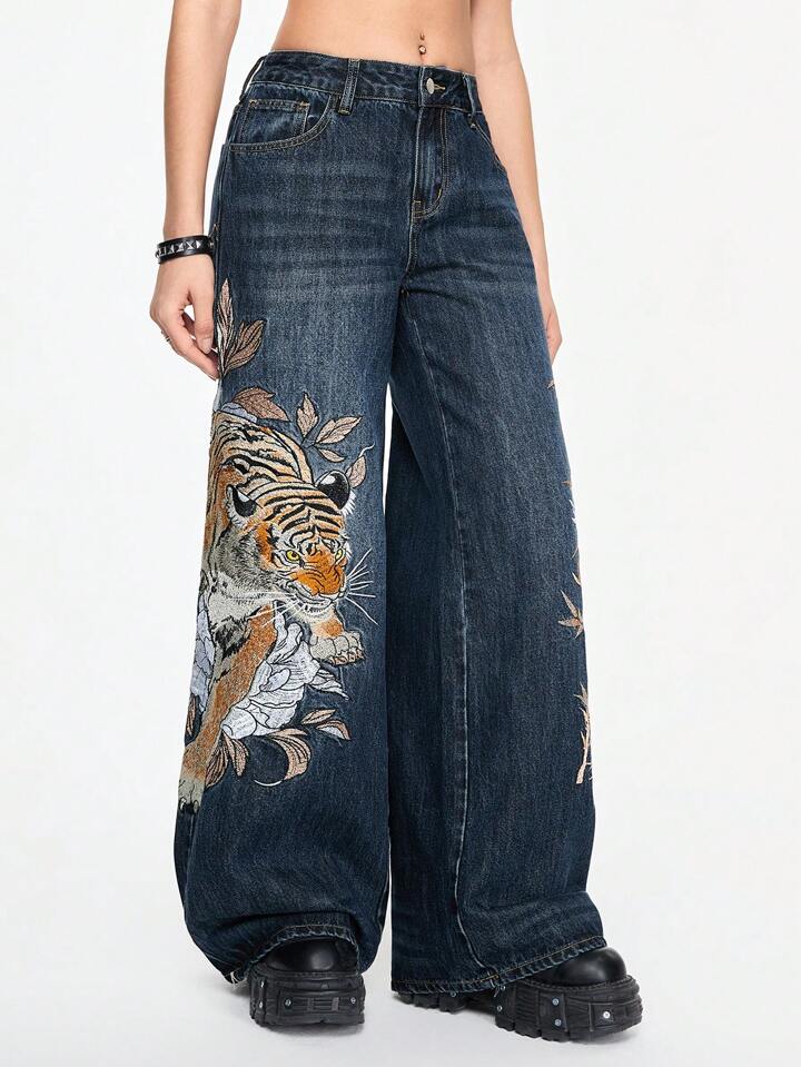 PETITE Unisex Retro Street-Style Chinese Tiger & Floral Embroidery Loose Wide-Leg Jeans