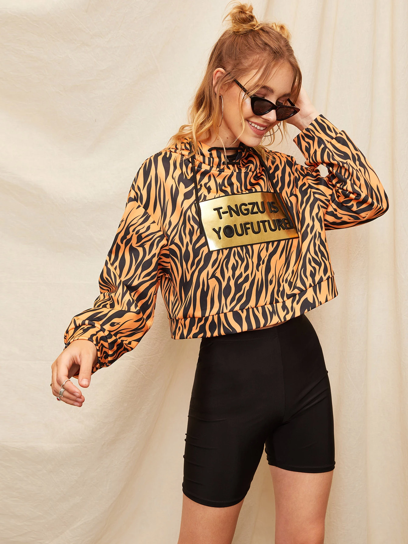Patch Detail Tiger Pattern Drawstring Hoodie