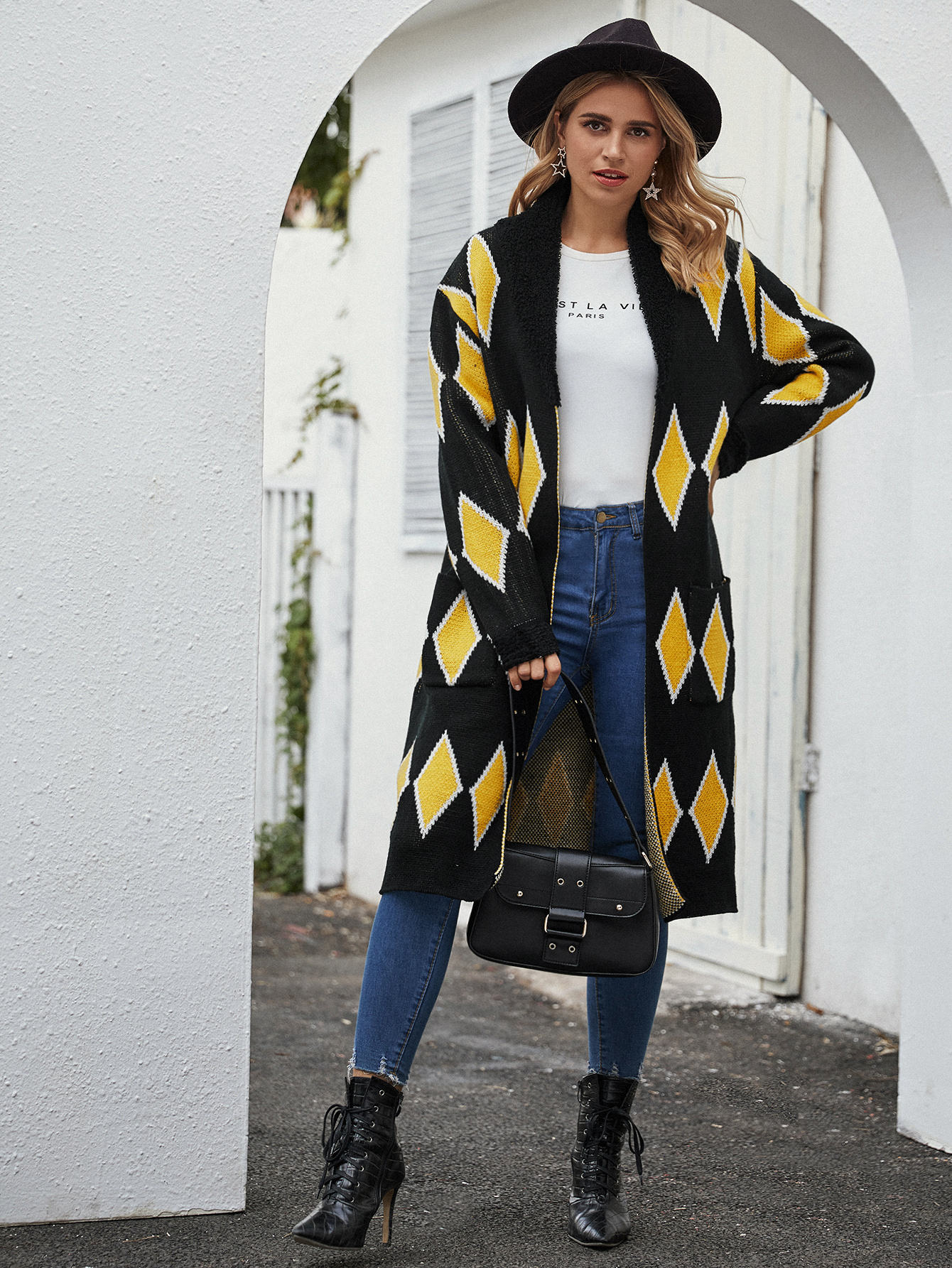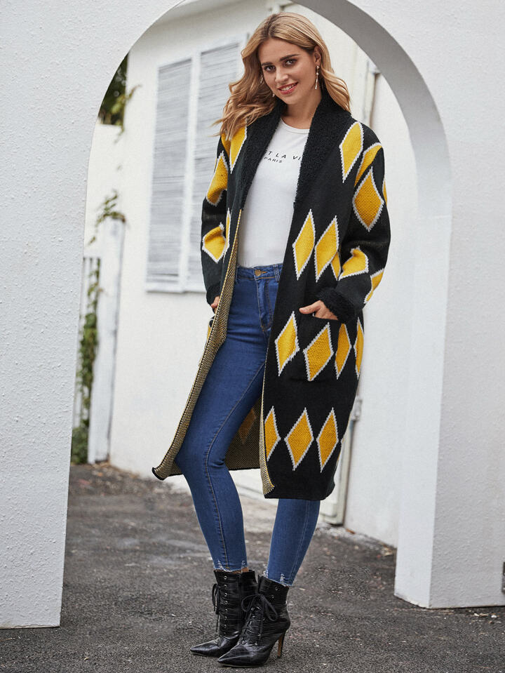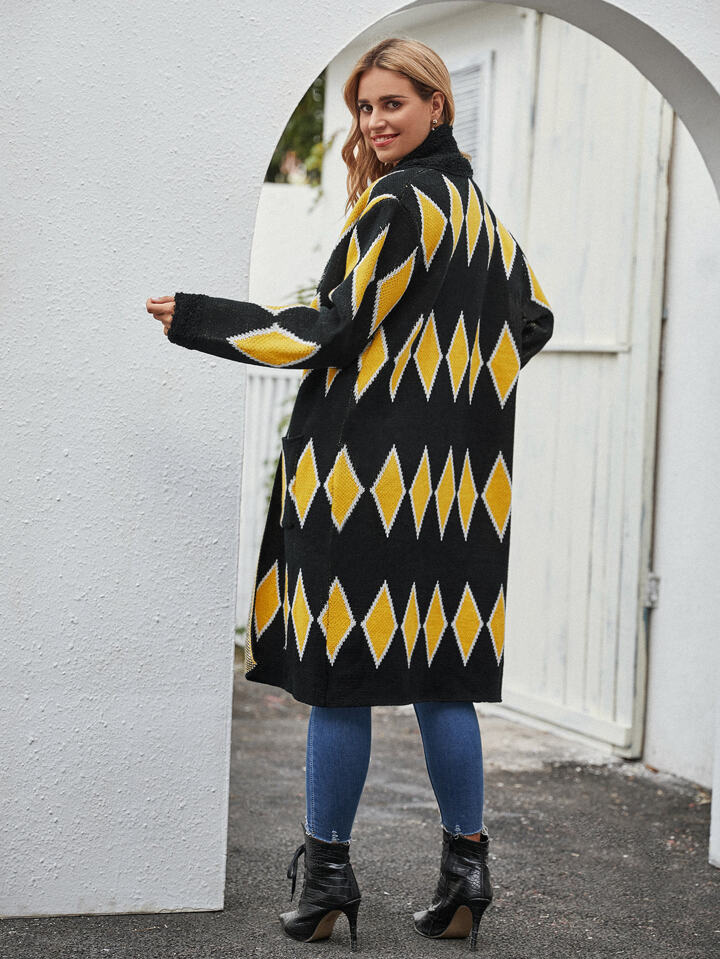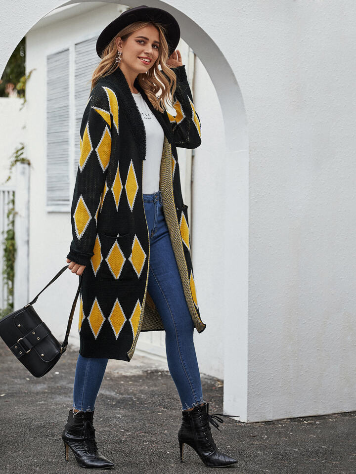 Patch Pocket Argyle Knit Longline Cardigan