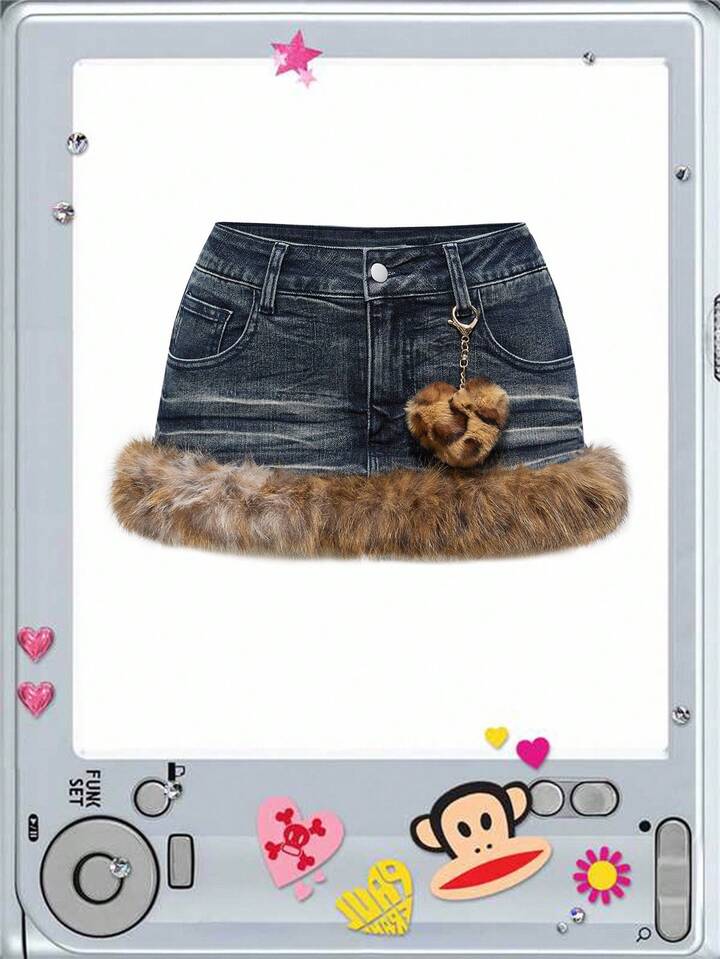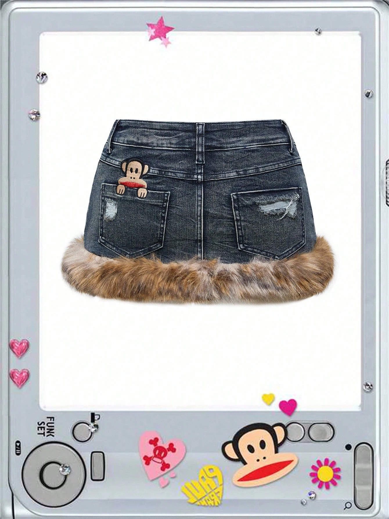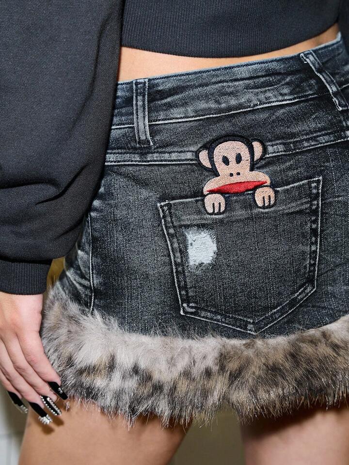 Paul Frank X ROMWE Collab Y2K Girly Patchwork Faux Fur Leopard Print Heart Pendant Super Low Waist Women Denim Mini Skirt