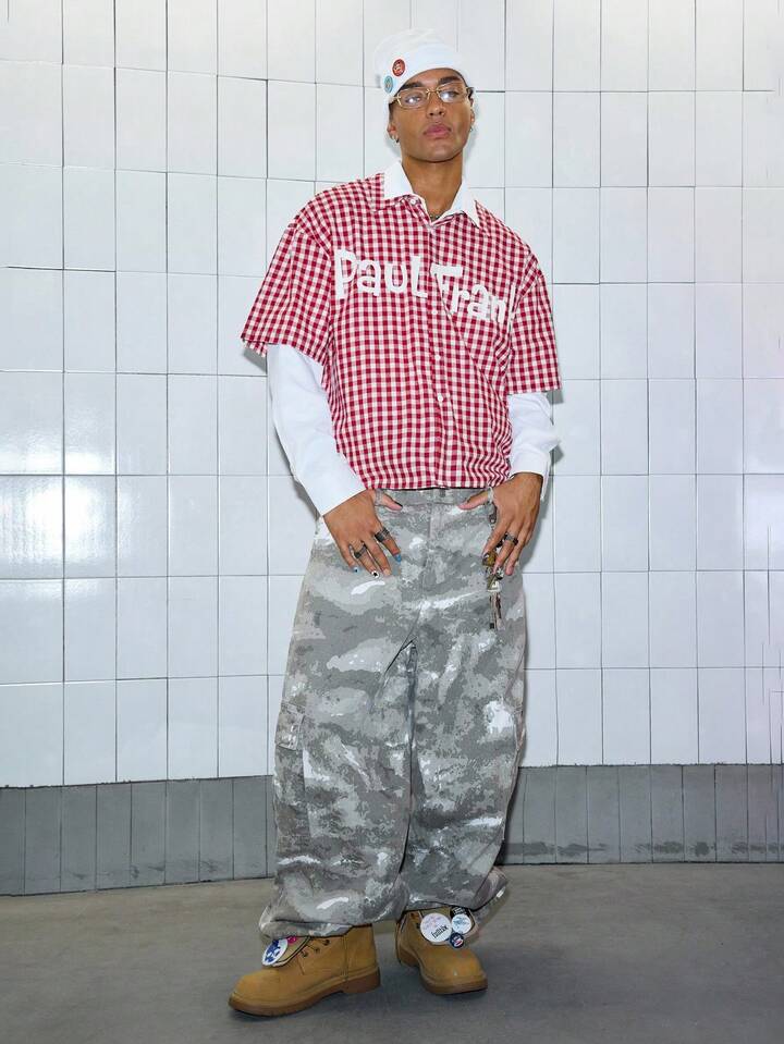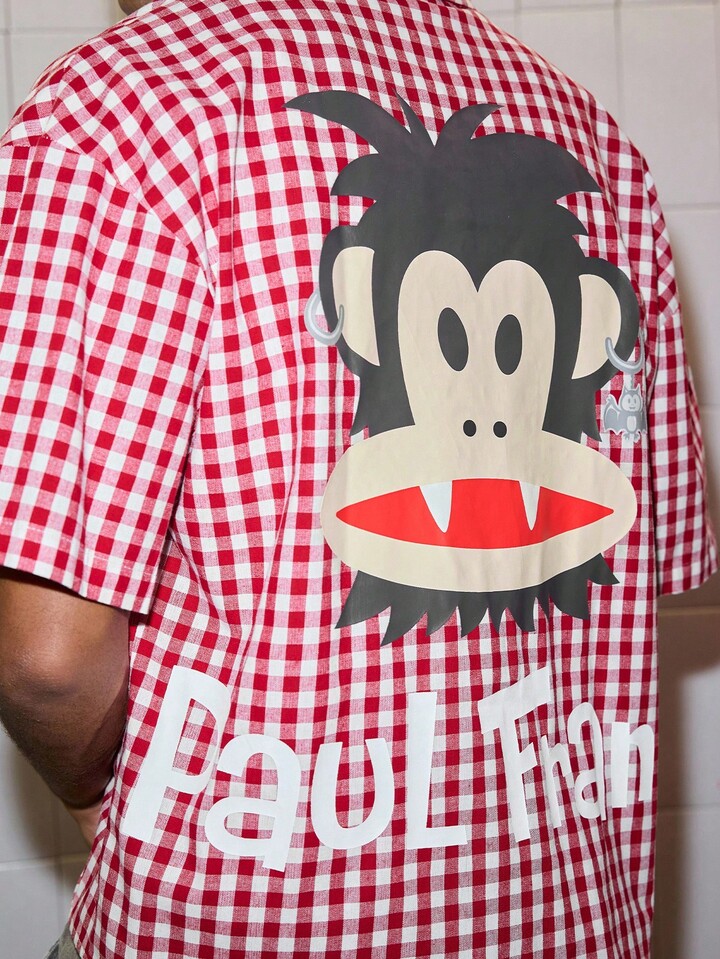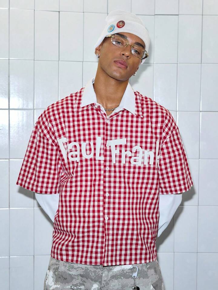 Paul Frank X ROMWE Men's Letter & Cartoon Pattern Plaid Short Sleeve Shirt