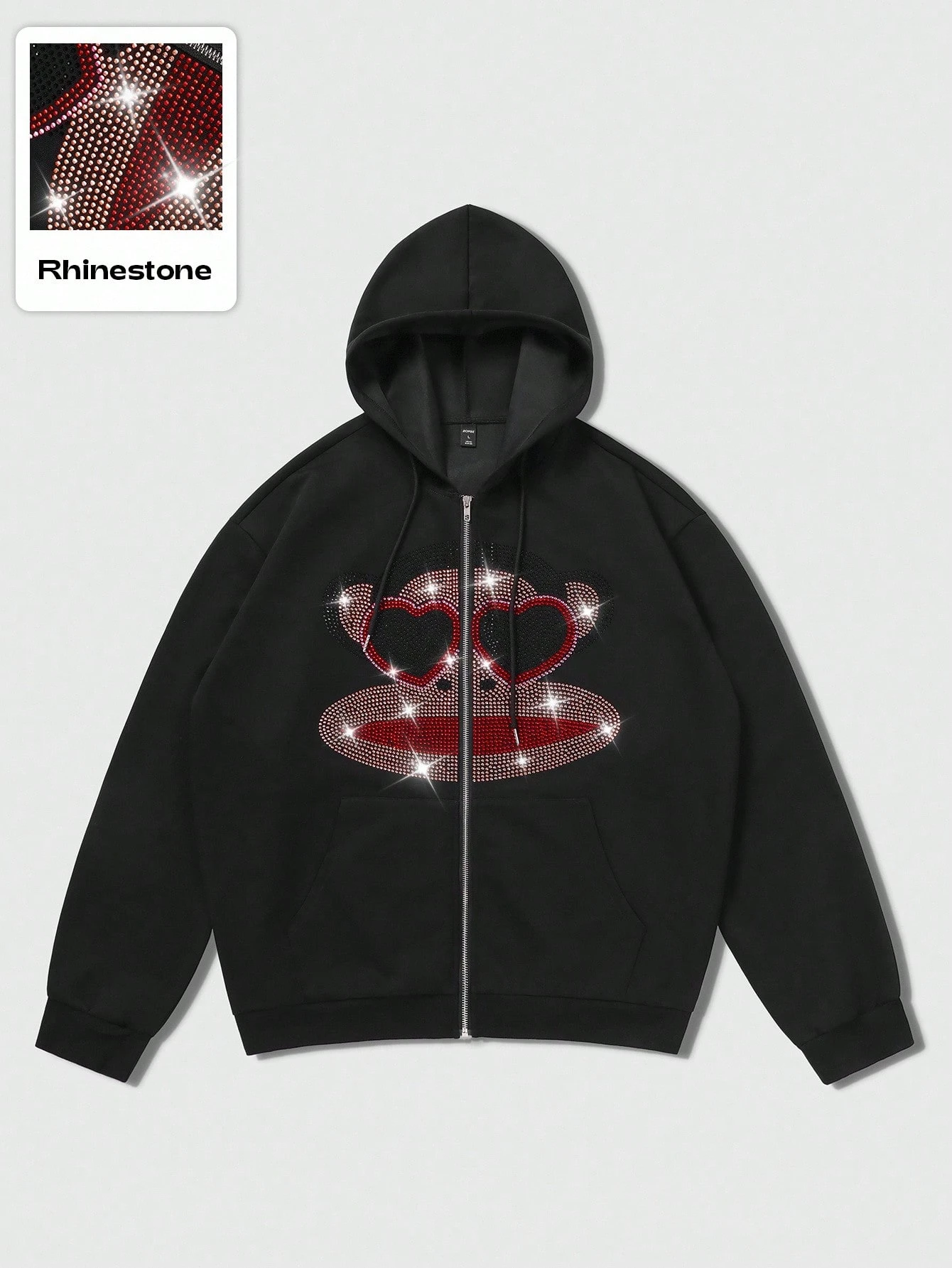 Paul Frank X ROMWE Men's Rhinestone Embellished Cartoon Pattern Zip Up Hooded Sweatshirt, Autumn/Winter