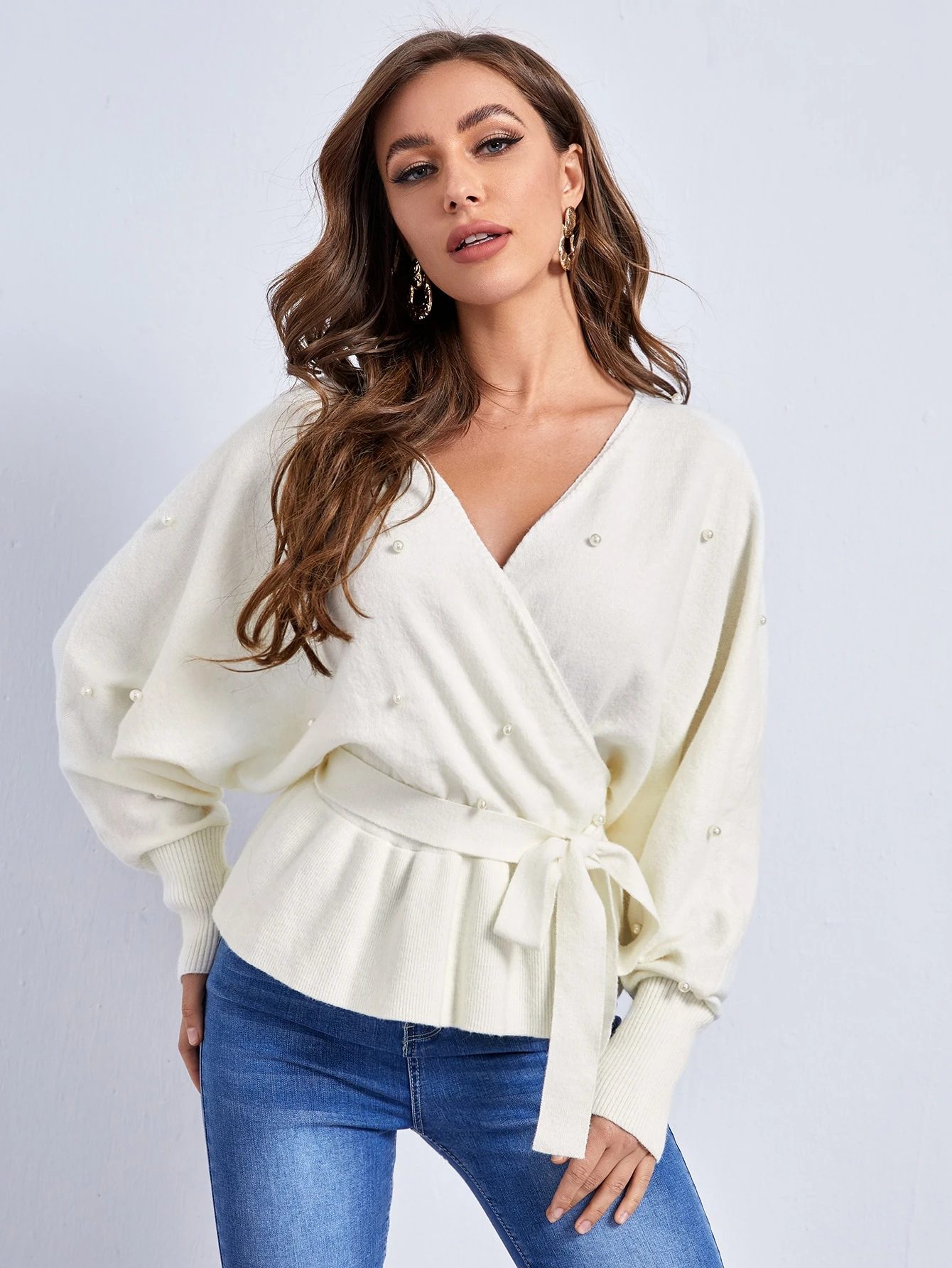 Pearl Beaded Wrap Detail Self Belted Sweater