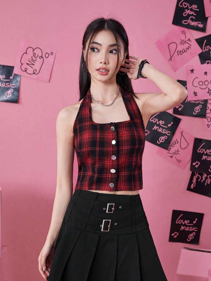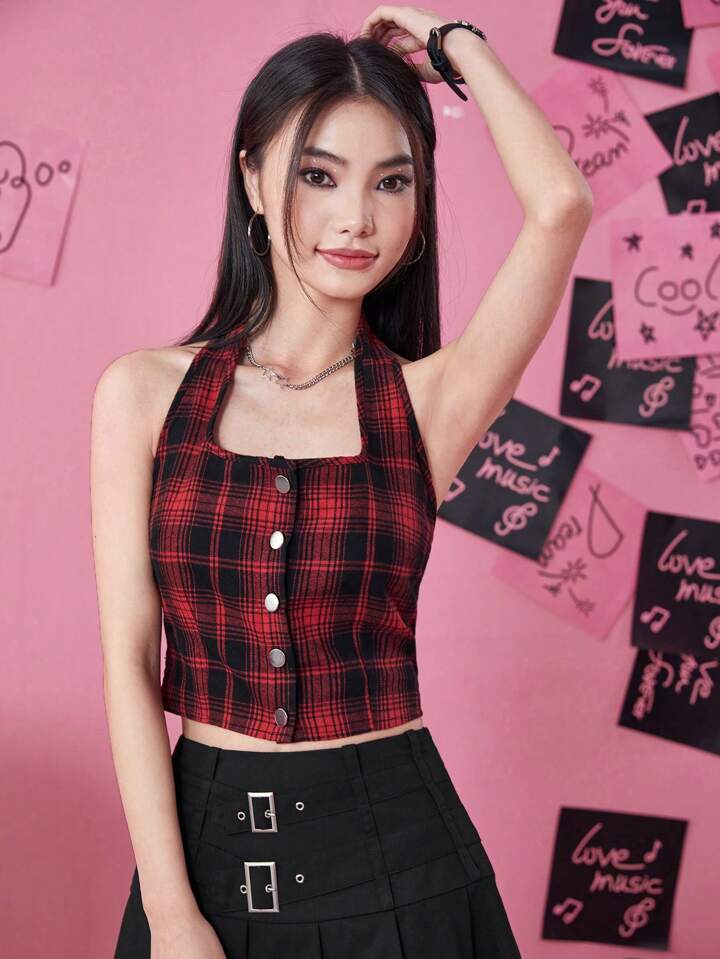 Plaid Print Button Front Halter Top